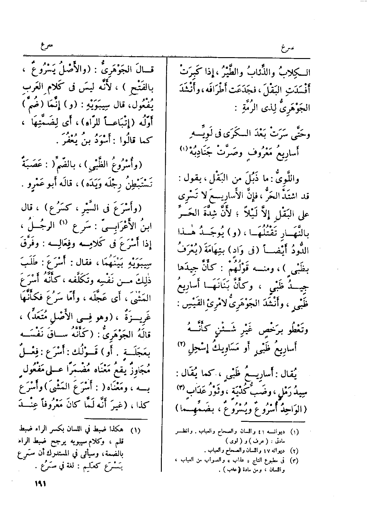 يُقَال: أساريعُ ظبيٍ، كَمَا يُقَال: سِيدُ رَمْلٍ، وضَبُّ كُدْيَةٍ، وثَوْرُ عَدَابٍ الواحدُ أُسْروعٌ ويُسْروعٌ، بضمِّهما، قَالَ الجَوْهَرِيّ: والأصلُ يَسْرُوعٌ، بالفَتْح، لأنّه لَيْسَ فِي كلامِ العربِ يُفْعولٌ، قَالَ سِيبَوَيْهٍ: إنّما ضُمَّ أوّلُه إتْباعاً للراءِ، أَي لضَمَّتِها، كَمَا قَالُوا: أَسْوَدُ بنُ يُعْفُر. وأُسْروعُ الظَّبْيِ، بالضَّمّ: عَصَبَةٌ تَسْتَبْطِنُ رِجلَه وَيَدَه، قَالَه أَبُو عمروٍ. وأَسْرَعَ فِي السَّيْر، كسَرُعَ، قَالَ ابْن الأَعْرابِيّ: سَرِعَ الرجلُ، إِذا أَسْرَعَ فِي كلامِه وفِعالِه، وفرَّقَ سِيبَوَيْهٍ بَينهمَا، فَقَالَ: أَسْرَعَ: طَلَبَ ذَلِك من نَفْسِه وَتَكَلَّفَه، كأنَّه أَسْرَعَ المَشْيَ، أَي عَجَّلَه، وأمّا سَرُعَ فكأنَّها غَريزَةٌ، وَهُوَ فِي الأصلِ مُتَعَدٍّ، قَالَه الجَوْهَرِيّ: كأنّه ساقَ نَفْسَه بعَجَلَةٍ. أَو قَوْلُك: أَسْرَع: فِعْلٌ مُجاوِزٌ يقعُ مَعْنَاه مُضمَراً على مَفْعُولٍ بِهِ، وَمَعْنَاهُ: أَسْرَعَ المَشيَ وأَسْرَعَ كَذَا، غيرَ أنَّه لمّا كَانَ مَعْرُوفا عندَ