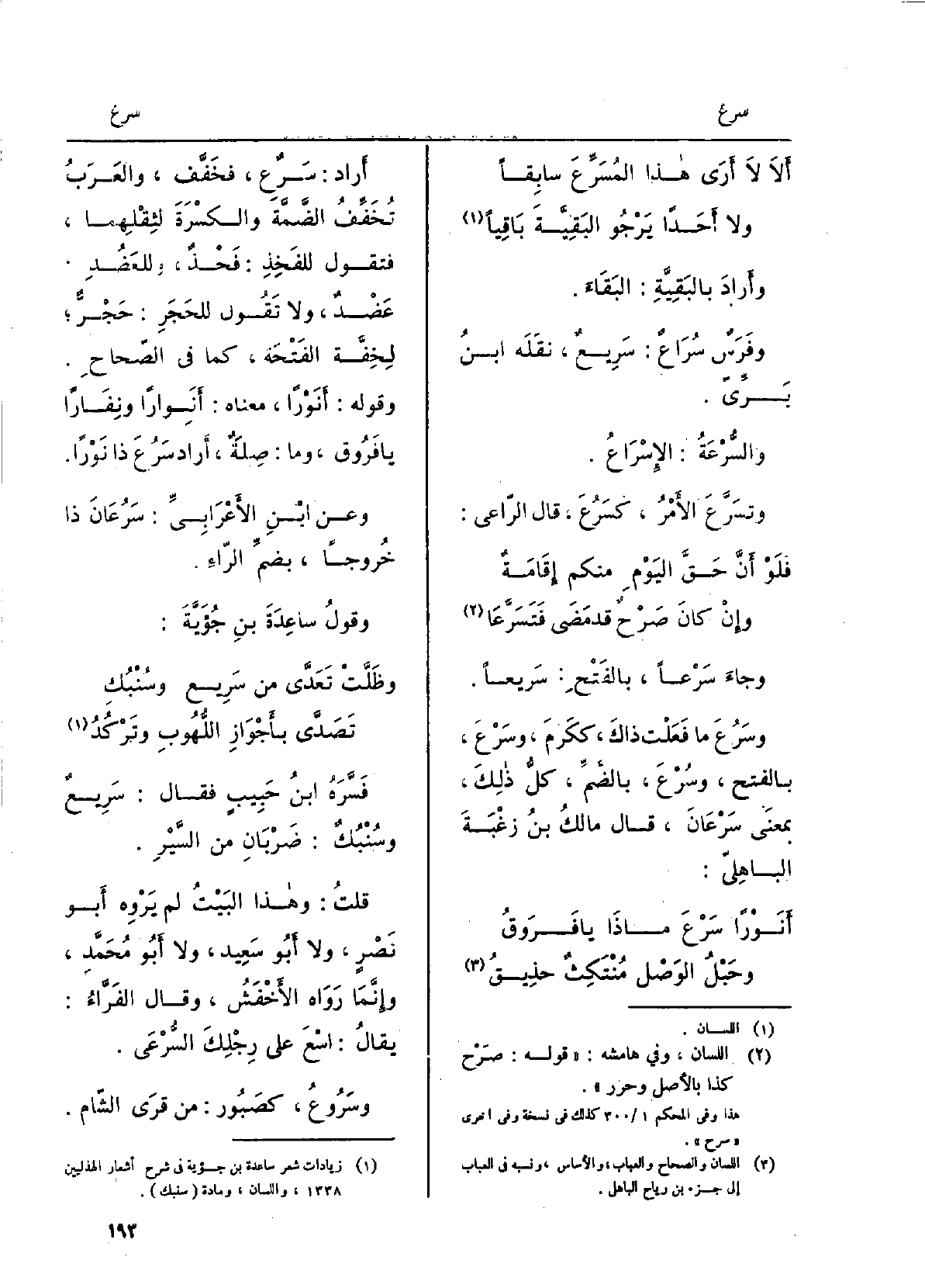 وأرادَ بالبقِيَّةِ: البَقاء. وفرَسٌ سُرَاعٌ: سَريعٌ، نَقَلَه ابنُ بَرّيّ. والسُّرْعَة: الإسْراع. وَتَسَرَّعَ الأمرُ، كسَرُعَ، قَالَ الرَّاعِي: