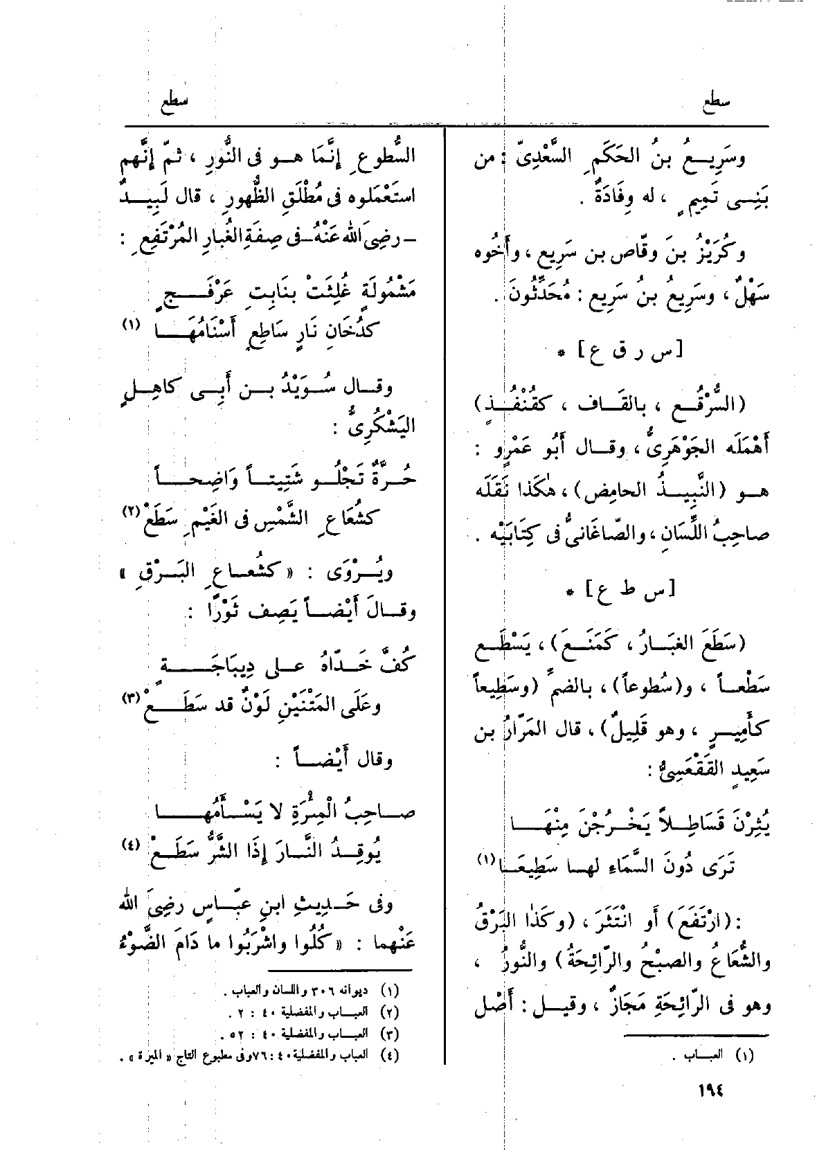 وَقيل: أَصْلُ السُّطوعِ إنّما هُوَ فِي النُّور، ثمّ إنّهم استعمَلوه فِي مُطلَقِ الظُّهور، قَالَ لَبيدٌ رَضِيَ اللهُ عَنهُ فِي صِفةِ الغُبارِ المُرتَفِع: