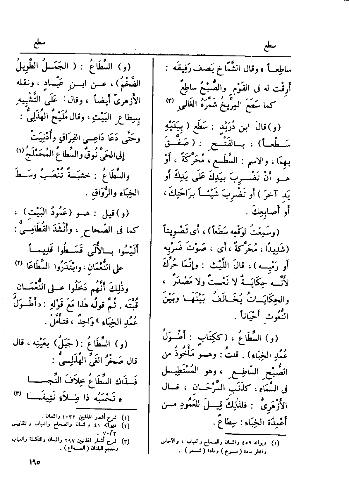 أَي، صَوْتَ ضَرْبِه أَو رَمْيِه، قَالَ الليثُ: وإنّما حُرِّكَ لأنّه حكايةٌ لَا نَعْتٌ وَلَا مصدرٌ، والحكاياتُ يُخالَفُ بَيْنَها وبَيْنَ النُّعوت أَحْيَانًا. السِّطَاع، ككِتابٍ: أَطْوَلُ عُمُدِ الخِبَاء. قلتُ: وَهُوَ مأخوذٌ من الصُّبْحِ الساطِع، وَهُوَ المُستَطيل فِي السَّماء، كَذَنَبِ السِّرْحان، قَالَ الأَزْهَرِيّ: فلذلكَ قيلَ للعَمُودِ من أَعْمِدةِ الخِباءِ: سِطاعٌ. السِّطاع: الجمَلُ الطويلُ الضخم، عَن ابنِ عَبّادٍ، وَنَقَله الأَزْهَرِيّ أَيْضا، وَقَالَ: على التشبيهِ بسِطاعِ البيتِ، وَقَالَ مُلَيْحٌ الهُذَليُّ: