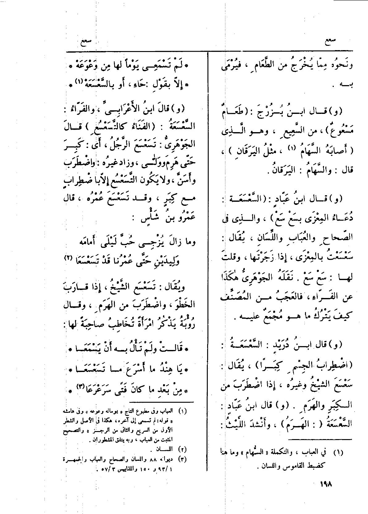 ونَحوُه ممّا يُخرَجُ من الطَّعَام، فيُرمى بِهِ. قَالَ ابنُ بُزُرْجَ: طعامٌ مَسْعُوعٌ، من السَّعيع، وَهُوَ الَّذِي أصابَه السَّهام، مثلُ اليَرَقان، قَالَ: والسَّهام: اليَرَقان. قَالَ ابنُ عَبّادٍ: السَّعْسَعَة: دُعاءُ المِعْزى بسَعْ سَعْ، وَالَّذِي فِي الصحاحِ والعُبابِ واللِّسان: يُقَال: سَعْسَعْتُ بالمِعْزى، إِذا زَجَرْتُها، وقلتَ لَهَا: سَعْ سَعْ. نَقله الجَوْهَرِيّ هَكَذَا عَن الفَرّاءِ، فالعجَبُ من المُصَنِّف كيفَ يَتْرُكُ مَا هُوَ مُجمَعٌ عَلَيْهِ. قَالَ ابْن دُرَيْدٍ: السَّعْسَعَة: اضطِرابُ الجِسمِ كِبَراً، يُقَال: سَعْسَعَ الشيخُ وغيرُه، إِذا اضطربَ من الكِبَرِ والهرَمِ. قَالَ ابنُ عَبّادٍ: السَّعْسَعَة: الهرَمُ، وأنشدَ الليثُ: