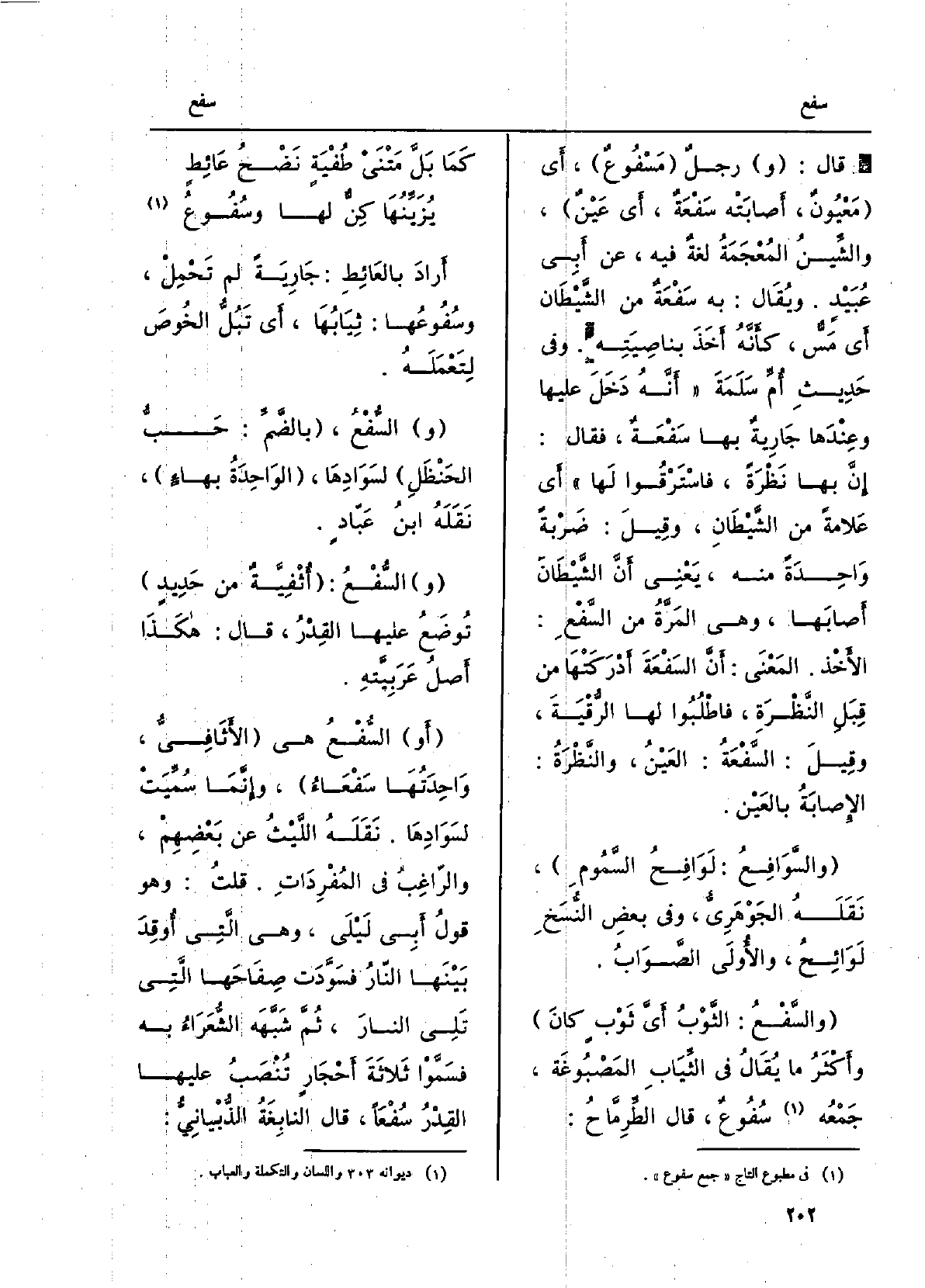 قَالَ: رجلٌ مَسْفُوعٌ، أَي مَعْيُونٌ، أصابَتْه سَفْعَةٌ، أَي عَيْنٌ، والشينُ المُعجَمةُ لغةٌ فِيهِ، عَن أبي عُبَيْدٍ. وَيُقَال: بِهِ سَفْعَةٌ من الشَّيْطَان أَي مَسٌّ، كأنّه أَخَذَ بناصِيَته. وَفِي حديثِ أمِّ سَلَمَةَ: أنّه دَخَلَ عَلَيْهَا وعِندَها جارِيَةٌ بهَا سَفْعَةٌ، فَقَالَ: إنَّ بهَا نَظْرَةً، فاسْتَرْقُوا لَهَا. أَي عَلامةً من الشَّيْطَان، وَقيل: ضَرْبَةً وَاحِدَة مِنْهُ، يَعْنِي أنّ الشيطانَ أصابَها، وَهِي المَرَّةُ من السَّفْعِ، الأَخْذ.