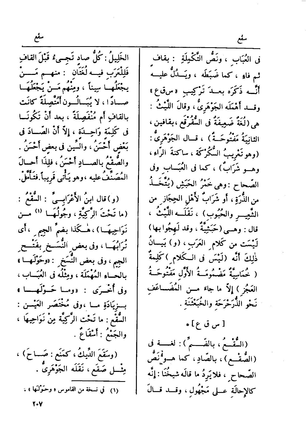 السُّقْع، بالضَّمّ: لغةٌ فِي الصُّقْع، بالصَّاد، كَمَا هُوَ نصُّ الصِّحَاح، فَلَا يرِدُ مَا قَالَه شَيْخُنا: إنّه كالإحالَةِ على مجهولٍ، وَقد قَالَ الخليلُ: كلُّ صادٍ تَجِيءُ قبلَ القافِ فلِلْعَرَبِ فِيهِ لُغَتان: مِنْهُم من يجعلُها سيناً، وَمِنْهُم من يجعلُها صاداً، لَا يُبالون أَمُتَّصِلَةً كَانَت بالقافِ أم مُنفَصِلةً، بعد أَن تَكُونَا فِي كلمةٍ واحدةٍ، إلاّ أنّ الصادَ فِي بعضٍ أَحْسَنُ، والسينُ فِي بعضٍ احسنُ. والصُّقْع بالصادِ أحسنُ، فلِذا أحالَ المُصَنِّف عَلَيْهِ، وَهُوَ يَأْتِي قَرِيبا. فَتَأَمَّلْ. قَالَ ابْن الأَعْرابِيّ: السُّقْع: مَا تحتَ الرَّكِيّةِ، وجُولُها من نَوَاحِيهَا، هَكَذَا بضمِّ الْجِيم، أَي تُرابُها، وَفِي بعضِ النّسخ بفتحِ الْجِيم، وَفِي بعضِ النّسخ: وحَولَها بالحاءِ المُهمَلة، ومِثلُه فِي العُباب، وَفِي أُخرى: وَمَا حَوْلَها بزيادةِ مَا، وَفِي مُختَصَرِ العَين: السُّقْع: مَا تحتَ الرّكِيّةِ من نَوَاحِيهَا، والجَمعُ: أَسْقَاعٌ. وسَقَعَ الديكُ، كَمَنَعَ: صاحَ، مثل صَقَعَ، نَقَلَه الجَوْهَرِيّ.