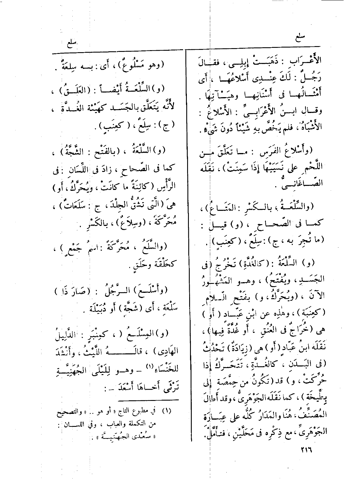 وأَسْلَعَ الرَّجُلُ: صارَ ذَا سَلْعَةٍ، أَي شَجَّةٍ أَو دُبَيْلَةٍ. المِسْلَعُ: كمِنْبَرٍ: الدَّليلُ الْهَادِي، قَالَه الليثُ، وأَنشدَ للخَنساءِ وَهُوَ للَيلى الجُهَنِيَّةِ تَرْثَى أَخاها أَسْعَدَ:
