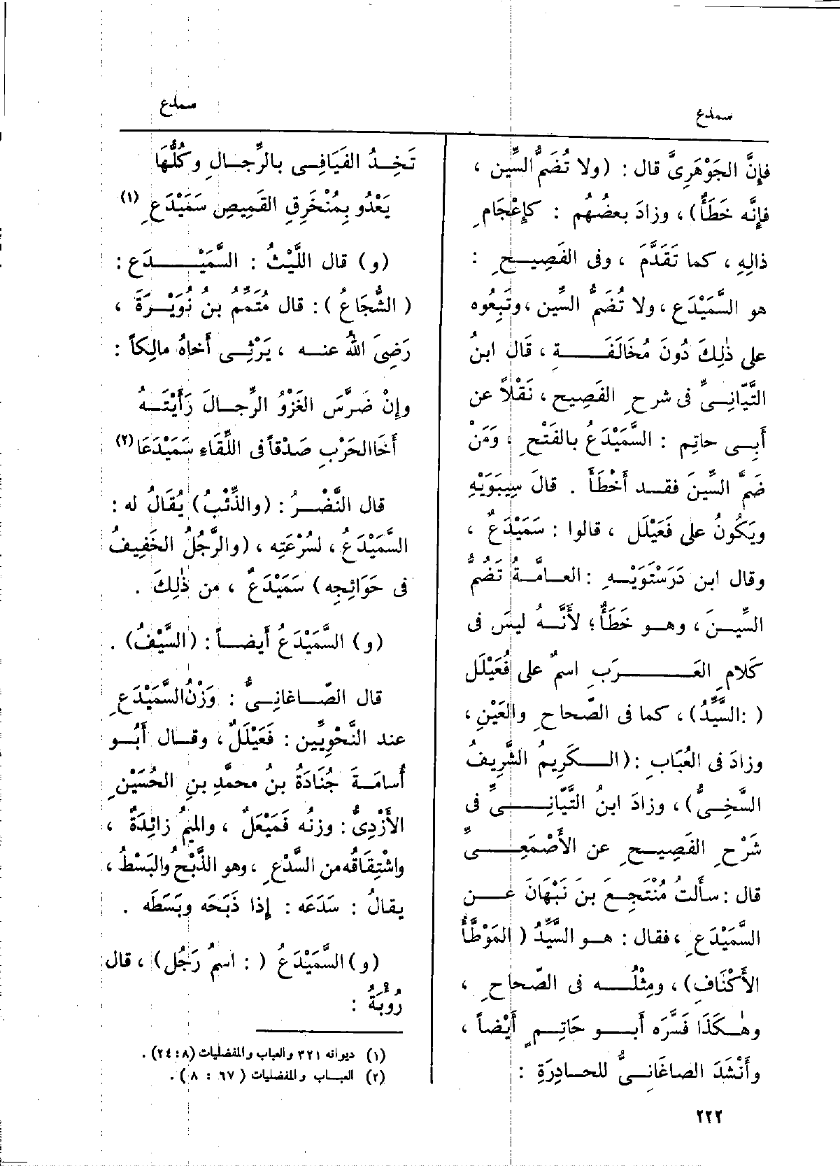 قَالَ الليثُ: السَّمَيْدَع: الشُّجاعُ، قَالَ مُتَمِّمُ بنُ نُوَيْرَةَ، رَضِي الله عَنهُ، يَرثي أَخاهُ مالِكاً: