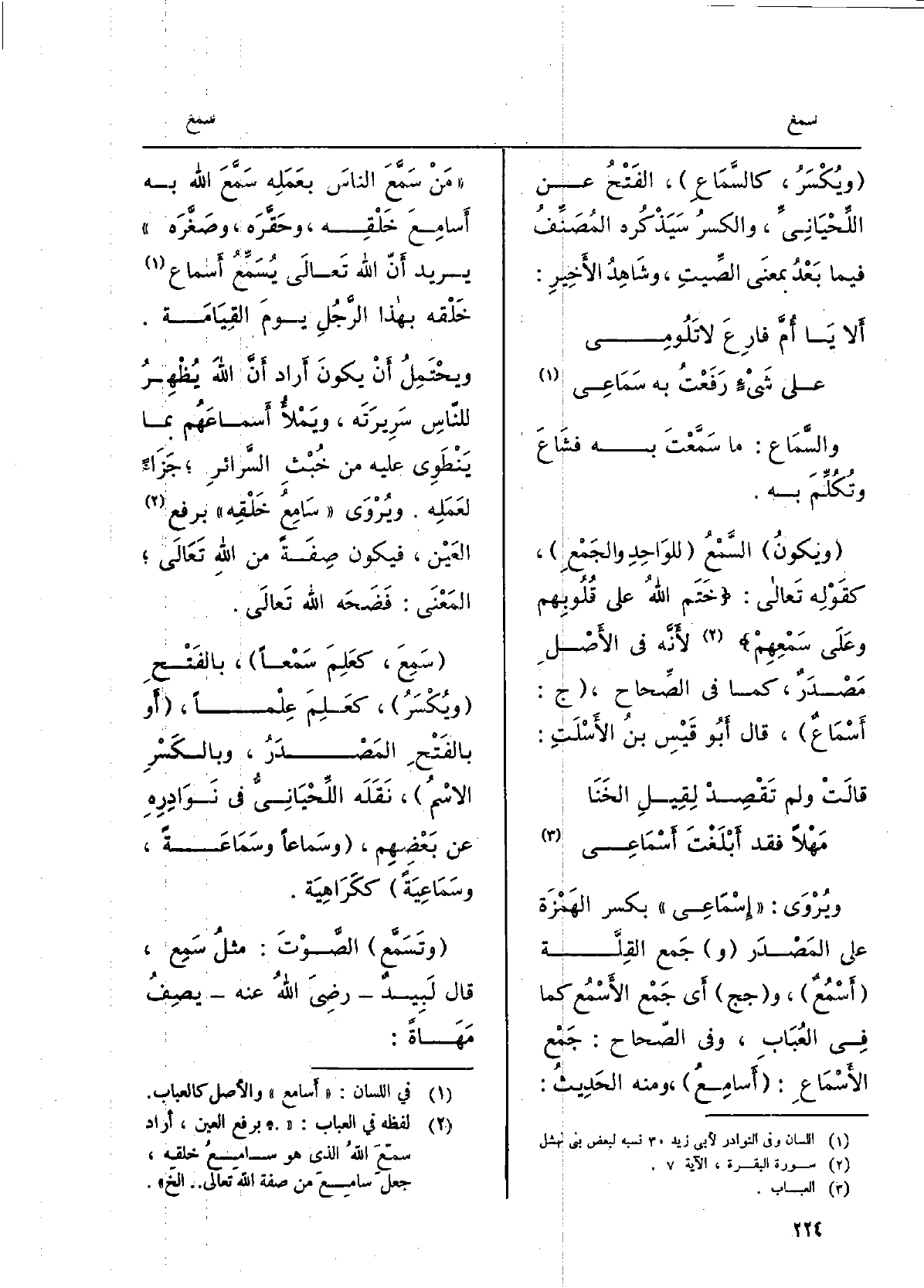 ويحتَمِلُ أَن يكون أرادَ أنّ اللهَ يُظهِرُ للناسِ سَريرَتَه، ويَملأُ أسماعَهم بِمَا يَنْطَوي عَلَيْهِ من خُبثِ السَّرائر جَزاءً لعمَلِه، ويُروى سامِعُ خَلْقِه بِرَفْع العَين، فَيكون صفة من الله تَعالى الْمَعْنى: فَضَحَه الله تَعالى. سَمِعَ، كعَلِمَ سَمْعَاً، بالفَتْح ويُكسَر، كعَلِمَ عِلْماً، أَو بالفَتْح المصدرُ، وبالكَسْر الِاسْم، نَقَلَه اللِّحْيانيّ فِي نَوادِرِه عَن بَعضهم، وسَماعاً وسَماعَةً، وسَماعِيَةً ككَراهِيَة. وَتَسَمَّعَ الصوتَ: مثلُ سَمِعَ، قَالَ لَبيدٌ رَضِيَ اللهُ عَنهُ يصفُ مَهاةً: