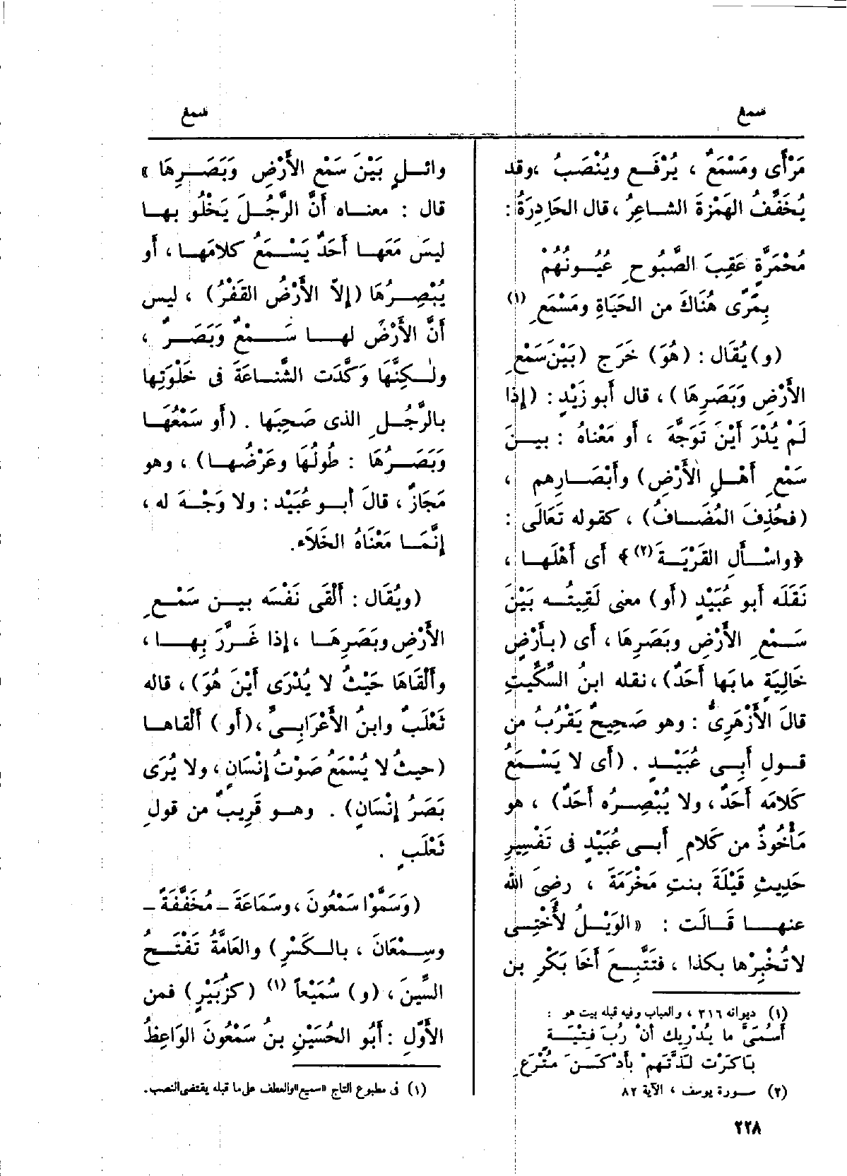 يُقَال: هُوَ خَرَجَ بَيْنَ سَمْعِ الأرضِ وبَصَرِها، قَالَ أَبُو زَيْدٍ: إِذا لم يُدْرَ أينَ توَجَّه، أَو مَعْنَاهُ: بينَ سَمْعِ أَهْلِ الأرضِ وأبْصارِهم، فحُذِفَ المُضافُ، كقولِه تَعَالَى: واسْأَلِ القَريةَ أَي أَهْلَها، نَقَلَه أَبُو عُبَيْد أَو معنى لَقيتُه بينَ سَمْعِ الأرضِ وبصَرِها، أَي بأرضٍ خالِيَةٍ مَا بهَا أحَدٌ، نَقله ابْن السِّكِّيت، قَالَ الأَزْهَرِيّ: وَهُوَ صحيحٌ يَقْرُبُ من قولِ أبي عُبَيْدٍ. أَي لَا يَسْمَعُ كلامَه أحدٌ، وَلَا يُبصِرُه أحدٌ، هُوَ مأخوذٌ من كلامِ أبي عُبَيْدٍ فِي تفسيرِ حديثِ قَيْلَةَ بنتِ مَخْرَمةَ، رَضِيَ الله عَنْهَا قَالَت: الوَيلُ لأُختي لَا تُخْبِرْها بِكَذَا، فَتَتَبَّعَ أَخا بَكْرِ بنِ وائلٍ بينَ سَمْعِ الأرضِ وَبَصَرِها. قَالَ: مَعْنَاهُ أنّ الرجلَ يَخْلُو بهَا ليسَ مَعهَا أحدٌ يَسْمَعُ كلامَها، أَو يُبصِرُها إلاّ الأرضُ القَفْر، لَيْسَ أنّ الأرضَ لَهَا سَمْعٌ وَبَصَرٌ، ولكنّها وَكَّدَت الشَّناعةَ فِي خَلْوَتِها بالرجلِ الَّذِي صَحِبَها، أَو سَمْعُها وَبَصَرُها: طُولُها وَعَرْضُها، وَهُوَ مَجاز، قَالَ أَبُو عُبَيْدٍ: وَلَا وَجْهَ لَهُ، إنّما مَعْنَاهُ الخَلاء. وَيُقَال: أَلْقَى نَفْسَه بَين سَمْعِ الأرضِ وَبَصَرِها، إِذا غَرَّرَ بهَا، وأَلْقَاها حيثُ لَا يُدرى أَيْن هُوَ، قَالَه ثعلبٌ وابْن الأَعْرابِيّ، أَو أَلْقَاهَا حيثُ لَا يُسمَعُ صَوْتُ إنسانٍ، وَلَا يُرى بصَرُ إنسانٍ. وَهُوَ قريبٌ من قولِ ثَعْلَبٍ. وسَمَّوا سَمْعُون، وَسَمَاعَةَ مُخَفّفةً وسِمْعانَ، بالكَسْر والعامّةُ تَفْتَحُ السينَ،)