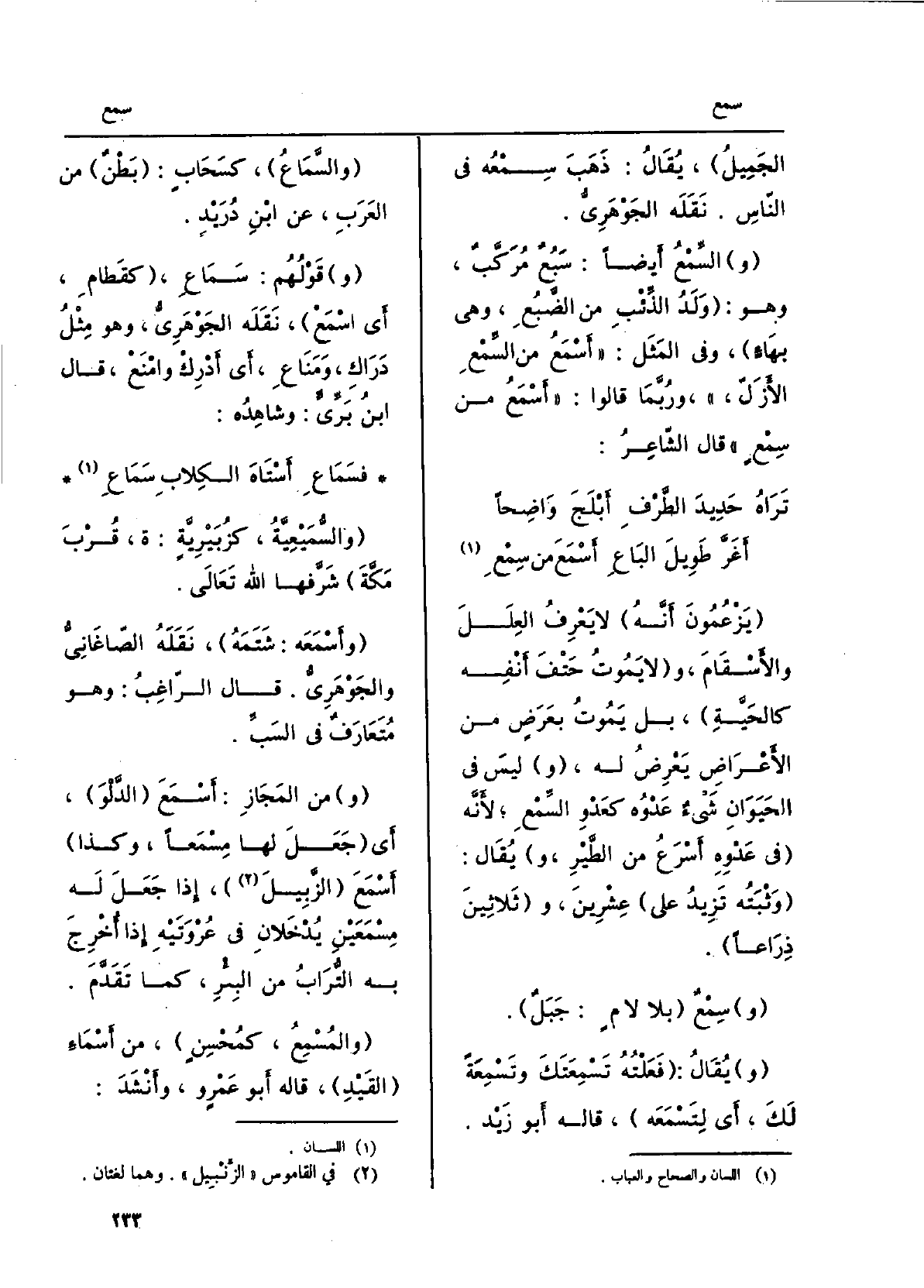 يَزْعُمون أنّه لَا يَعْرِفُ العِلَلَ والأسْقام، وَلَا يموتُ حَتْفَ أَنْفِه كالحَيَّة، بل يموتَ بعَرَضٍ من الْأَعْرَاض يَعْرِضُ لَهُ، لَيْسَ فِي الحيوانِ شيءٌ عَدْوُه كَعَدْوِ السِّمْعِ لأنّه فِي عَدْوِه أَسْرَعُ من الطَّيْرِ، وَيُقَال: وَثْبَتُه تزيدُ على عِشرينَ، وثلاثينَ ذِراعاً. سِمْعٌ بِلَا لامٍ: جبَلٌ. يُقَال: فَعَلْتُه تَسْمِعَتَكَ وتَسْمِعَةً لَك، أَي لتَسْمَعَه، قَالَه أَبُو زَيْد. والسَّمَاع، كَسَحَابٍ: بطنٌ من العربِ، عَن ابْن دُرَيْدٍ. قولُهم: سَماعِ، كَقَطَام، أَي اسْمَع، نَقَلَه الجَوْهَرِيّ، وَهُوَ مِثلُ دَرَاكِ، ومَناعِ، أَي أَدْرِكْ وامْنَعْ، قَالَ ابنُ بَرّيّ: وشاهِدُه: فَسَمَاعِ أَسْتَاهَ الكلابِ سَماعِ والسُّمَيْعِيَّةُ، كزُبَيْرِيَّةٍ: ة، قربَ مكّةَ شرَّفَها الله تَعالى. وأَسْمَعَه: شَتَمَه، نَقَلَه الصَّاغانِيّ والجَوْهَرِيّ. قَالَ الراغبُ: وَهُوَ مُتَعارَفٌ فِي السَّبِّ. منَ المَجاز: أَسْمَعَ الدَّلْوَ، أَي جَعَلَ لَهَا مِسْمَعاً، وَكَذَا أَسْمَعَ الزَّبيلَ، إِذا جَعَلَ لَهُ مِسْمَعَيْنِ يُدخَلانِ فِي عُروَتَيْه إِذا أُخرِجَ بِهِ التُّرابُ من الْبِئْر، كَمَا تقدّم. والمُسْمِع، كمُحسِنٍ، من أسماءِ القَيْد، قَالَه أَبُو عمروٍ، وأنشدَ:)