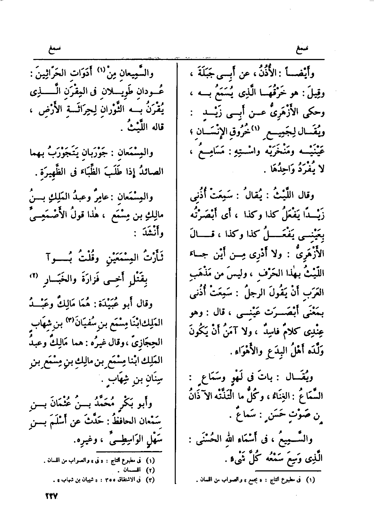 وَأَيْضًا: الأُذُن، عَن أبي جَبَلَةَ، وَقيل: هُوَ خَرْقُها الَّذِي يُسمَعُ بِهِ، وَحكى الأَزْهَرِيّ عَن أبي زَيْدِ: وَيُقَال لجَميعِ خُروقِ الإنسانِ عَيْنَيْه ومَنْخَريْه واسْتِه، مَسامِع، لَا يُفرَدُ واحدُها. وَقَالَ الليثُ: يُقَال: سَمِعَتْ أُذُني زَيْدَاً يَفْعَلُ كَذَا وَكَذَا، أَي أَبْصَرْتُه بعَيْني يَفْعَلُ كَذَا وَكَذَا، قَالَ الأَزْهَرِيّ: وَلَا أَدْرِي من أَيْن جاءَ الليثُ بِهَذَا الحرفِ، وَلَيْسَ من مَذْهَبِ العربِ أَن يقولَ الرجلُ: سَمِعَتْ أُذُني بِمَعْنى أَبْصَرَتْ عَيْني، قَالَ: وَهُوَ عِنْدِي كلامٌ فاسِدٌ، وَلَا آمَنُ أَن يكونَ ولَّدَه أَهْلُ البِدَعِ والأهواء. وَيُقَال: باتَ فِي لَهْوٍ وسَماعٍ: السَّماع: الغِناء، وكلُّ مَا الْتَذَّتْه الآذانُ من صوتٍ حسَنٍ: سَماعٌ. والسَّميع، فِي أسماءِ اللهِ الحُسْنى: الَّذِي وَسِعَ سَمْعُه كلَّ شيءٍ. والسَّميعانِ من أَدَوَاتِ الحَرّاثينَ: عُودانِ طَويلانِ فِي المِقْرَنِ الَّذِي يُقرَنُ بِهِ الثَّوْرانِ لحِراثَةِ الأرضِ، قَالَه الليثُ. والمِسْمَعان: جَوْرَبان يَتَجَوْرَبُ بهما الصائدُ إِذا طَلَبَ الظِّباءَ فِي الظَّهيرَة. والمِسْمَعان: عامِرٌ وعبدُ الملكِ بنِ مالكِ بنِ مِسْمَعٍ، هَذَا قولُ الأَصْمَعِيّ، وأنشدَ: