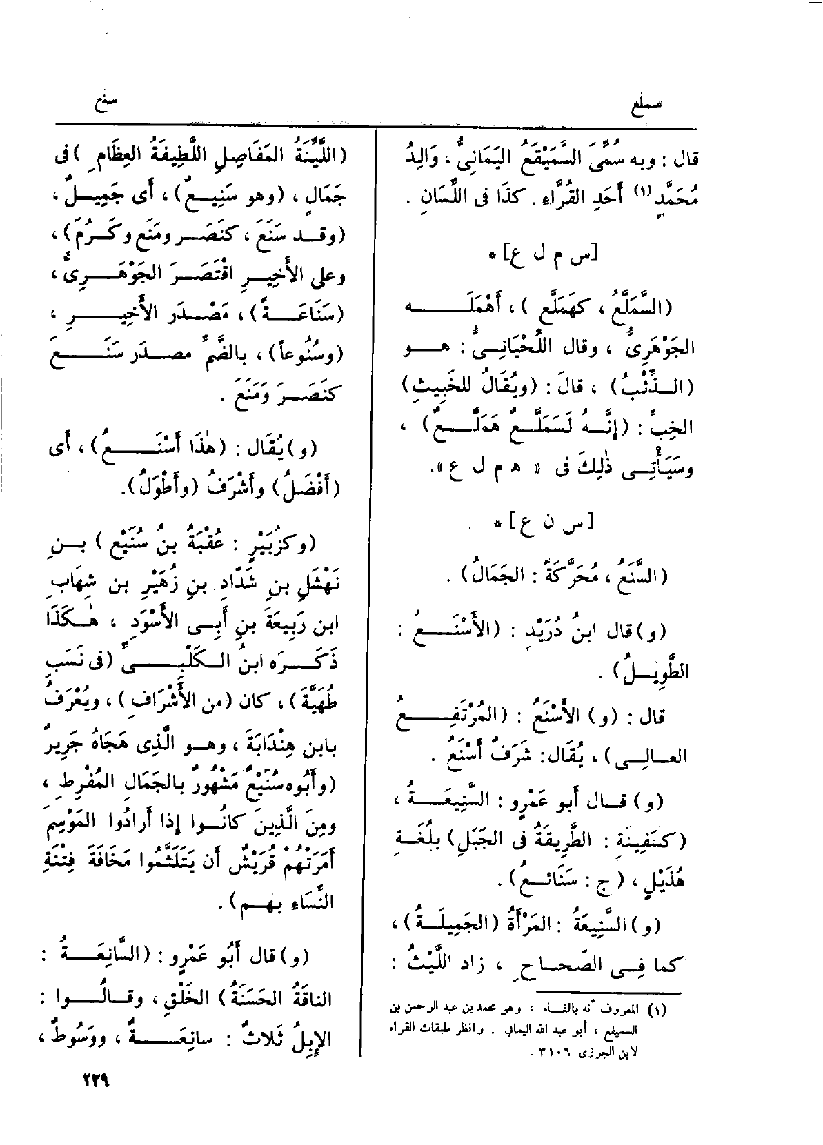 السَّنيعَة: المرأةُ الجميلة، كَمَا فِي الصِّحَاح، زادَ الليثُ: اللَّيِّنَةُ المَفاصِلِ اللطيفَةُ العِظامِ فِي جَمالٍ، وَهُوَ سَنيعٌ، أَي جَميلٌ، وَقد سَنَعَ، كَنَصَرَ ومَنَعَ وكَرُمَ، وعَلى الأخيرِ اقتصرَ الجَوْهَرِيّ، سَناعَةً، مصدرُ الْأَخير، وسُنوعاً، بالضَّمّ مصدر سَنَعَ كَنَصَرَ ومَنَعَ. يُقَال: هَذَا أَسْنَعُ، أَي أَفْضَلُ وأَشْرَفُ وأَطْوَلُ. وكزُبَيْر: عُقبَةُ بنُ سُنَيْع بن نَهْشَلِ بنِ شَدّادِ بنِ زُهَيْر بن شِهابِ بنِ رَبيعَةَ بنِ أبي الأَسْوَد، هَكَذَا ذَكَرَه ابنُ الكَلْبِيِّ فِي نسَبِ طُهَيَّةَ، كَانَ من الأشرافِ، ويُعرَفُ بِابْن هِنْدابَة، وَهُوَ الَّذِي هَجاهُ جَريرٌ وَأَبوهُ سُنَيْعٌ مشهورٌ بالجَمالِ المُفرِط، وَمن الَّذين كَانُوا إِذا أَرَادوا المَوسِمَ أَمَرَتْهُم قُرَيْشٌ أَن يَتَلَثَّموا مَخافةَ فِتنَةِ النساءِ بهم. قَالَ أَبُو عمروٍ: السَّانِعَة: الناقةُ الحسَنةُ الخَلْق، وَقَالُوا: الإبلُ ثلاثٌ: سانِعَة، ووَسُوطٌ،