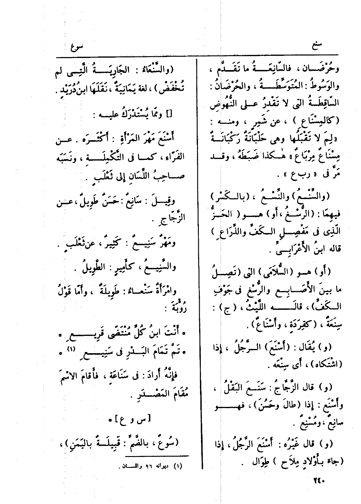 الزَّجَّاج. ومَهْرٌ سَنيعٌ: كَثيرٌ، عَن ثَعْلَبٍ. والسَّنيع، كأميرٍ: الطَّوِيل. وامرأةٌ سَنْعَاء: طويلةُ، وأمّا قولُ رُؤْبَة: