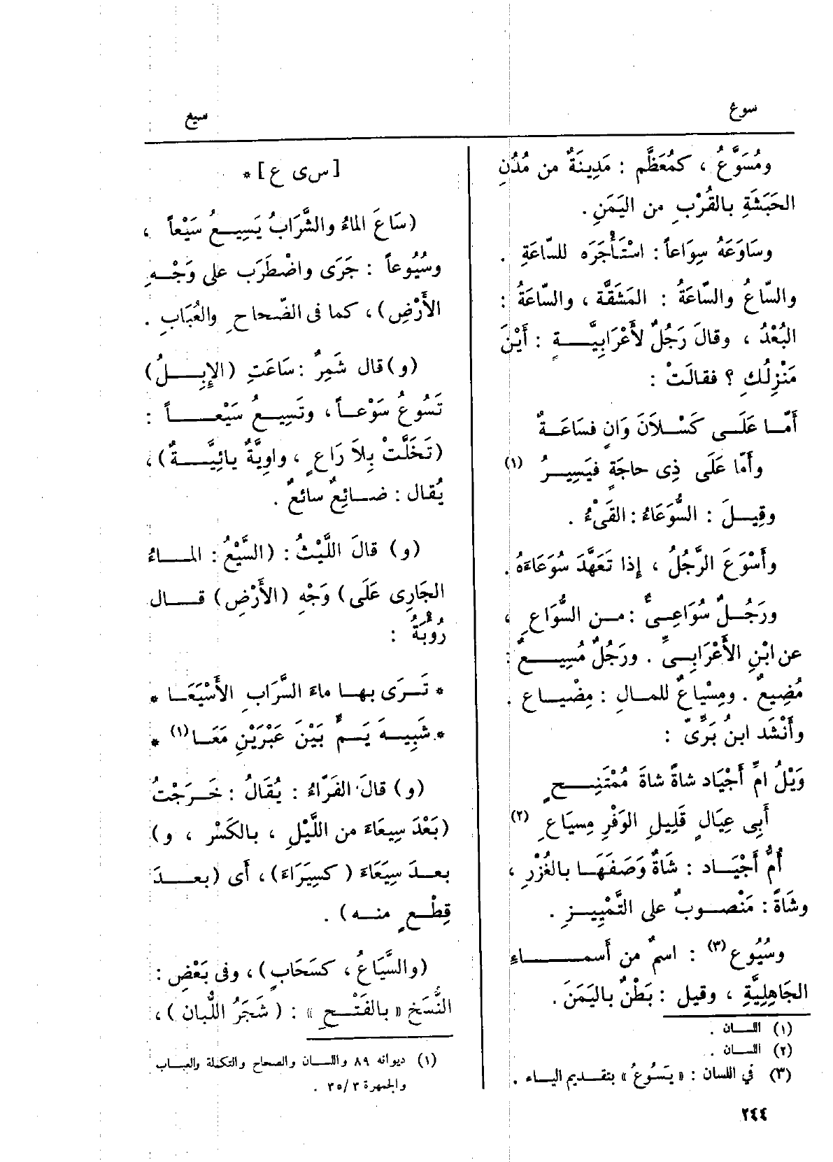 {ومُسَوَّعُ، كمُعَظَّم: مدينةٌ من مُدُنِ الحَبشَةِ بالقربِ من اليَمَنِ.} وساوَعَهُ {سِواعاً: اسْتأْجَرَه للسّاعة.} والسّاعُ والسّاعةُ: المَشَقَّة، والسّاعةُ: البُعْدُ، وَقَالَ رجُلٌ لأَعرابيَّةٍ: أَينَ مَنزِلُكِ فَقَالَت:)