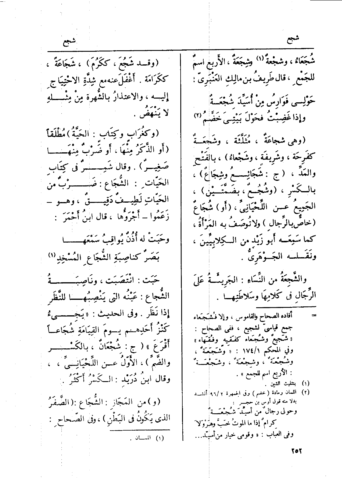 وَهِي شجاعةٌ، مُثلّثة، وشَجِعةٌ كفَرِحة، وشَريفةٍ، وشَجْعاء، بالفَتْح والمَدّ، ج: شَجائِعُ وشِجاعٌ، بالكَسْر، وشُجُعٌ، بضمَّتَيْن، الجميعُ عَن اللحيانيّ، أَو شُجاعٌ خاصٌّ بالرِّجالِ وَلَا تُوصَفُ بِهِ المرأةُ، كَمَا سَمِعَه أَبُو زيدٍ من الكِلابيِّين، وَنَقله الجَوْهَرِيّ. والشَّجِعَة من النِّسَاء: الجَريئَةُ على الرِّجالِ فِي كلامِها وسَلاطَتِها. وَقد شَجُعَ، ككَرُمَ، شَجاعَةً، ككَرامِة. أَغْفَلَ عَنهُ مَعَ شِدّةِ الاحتِياجِ إِلَيْهِ، والاعتذارُ بالشُّهرَةِ مِن مثلِه لَا يَنْهَض. وكغُرابٍ وكِتابٍ: الحَيّةُ مُطلَقاً أَو الذَّكَرُ مِنْهَا، أَو ضَرْبٌ مِنْهَا صغيرٌ، وَقَالَ شَمِرٌ فِي كتابِ الحَيّاتِ: الشُّجاع: ضَرْبٌ من الحَيّاتِ لطيفٌ دَقيقٌ، وَهُوَ زعَموا أَجْرَؤُها، قَالَ ابنُ أَحْمَرَ: