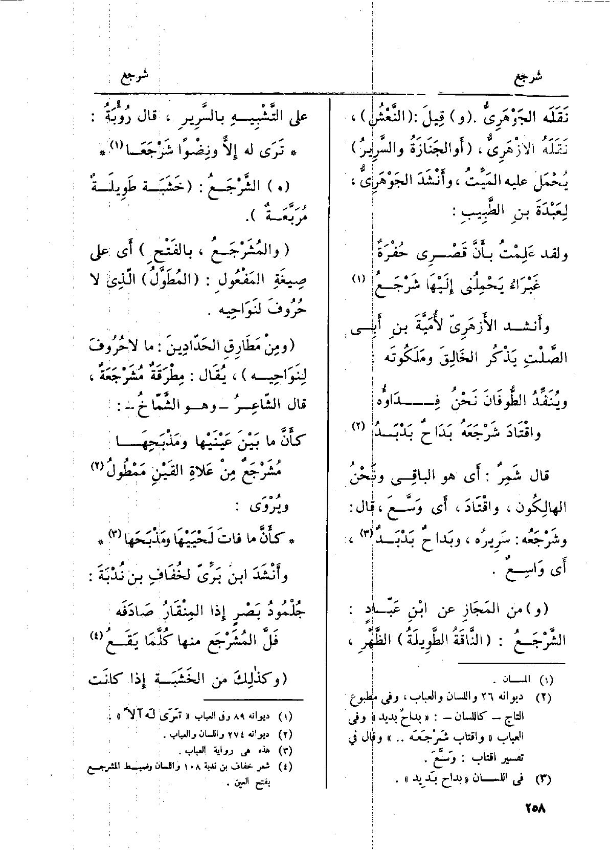 قَالَ شَمِرٌ: أَي هُوَ الْبَاقِي ونحنُ الهالكون، واقتادَ، أَي وَسَّعَ، قَالَ: وشَرْجَعُه: سَريرُه، وبَداحٌ بَدْبَدٌ، أَي واسِعٌ. منَ المَجازِ عَن ابنِ عَبّادٍ: الشَّرْجَعُ: النّاقةُ الطَّويلَةُ الظَّهْرِ، على التَّشبيه بالسَّريرِ، قَالَ رُؤْبَةُ: تَرى لَهُ ونِضْواً شَرْجَعا الشَّرْجَعُ: خشَبةٌ طويلَةٌ مُرَبَّعةٌ. والمُشَرْجَعُ، بِالْفَتْح، أَي على صيغَةِ المَفعول: المُطَوَّلُ الَّذِي لَا حُروفَ لِنَواحيه. ومِن مَطارِق الحَدَّادينَ: مَا لَا حُروفَ لِنواحيه، يُقال: مِطْرَقَةٌ مُشَرْجَعَةٌ، قَالَ الشَّاعِرُ وَهُوَ الشَّمّاخُ: