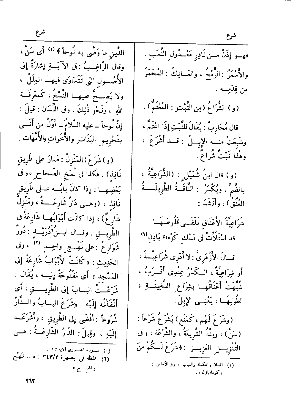 قَالَ الأَزْهَرِيّ: لَا أَدري شُراعِيَّةٌ، أَو شِراعِيَّةٌ، الكَسْرُ عِنْدِي أَقرَبُ، شُبِّهَتْ أَعناقُها بشراع السَّفينة، لِطولِها، يَعني الإبٍ لَ. وشَرَعَ لَهُم، كمَنَعَ يَشْرَعُ شَرْعاً: سَنَّ، وَمِنْه الشَّريعةُ، والشَّرْعَة، وَفِي التَّنزيل الْعَزِيز: شَرَعَ لكُمْ من الدِّينِ مَا وَصَّى بِهِ نوحًا أَي سَنَّ، وَقَالَ الرَّاغِبُ: فِي الْآيَة إشارةٌ إِلَى الأُصولِ الَّتِي تتساوى فِيهَا المِلَلُ، وَلَا يَصِحُّ عَلَيْهَا النَّسْخُ، كمعرفة الله، وَنَحْو ذلكَ.