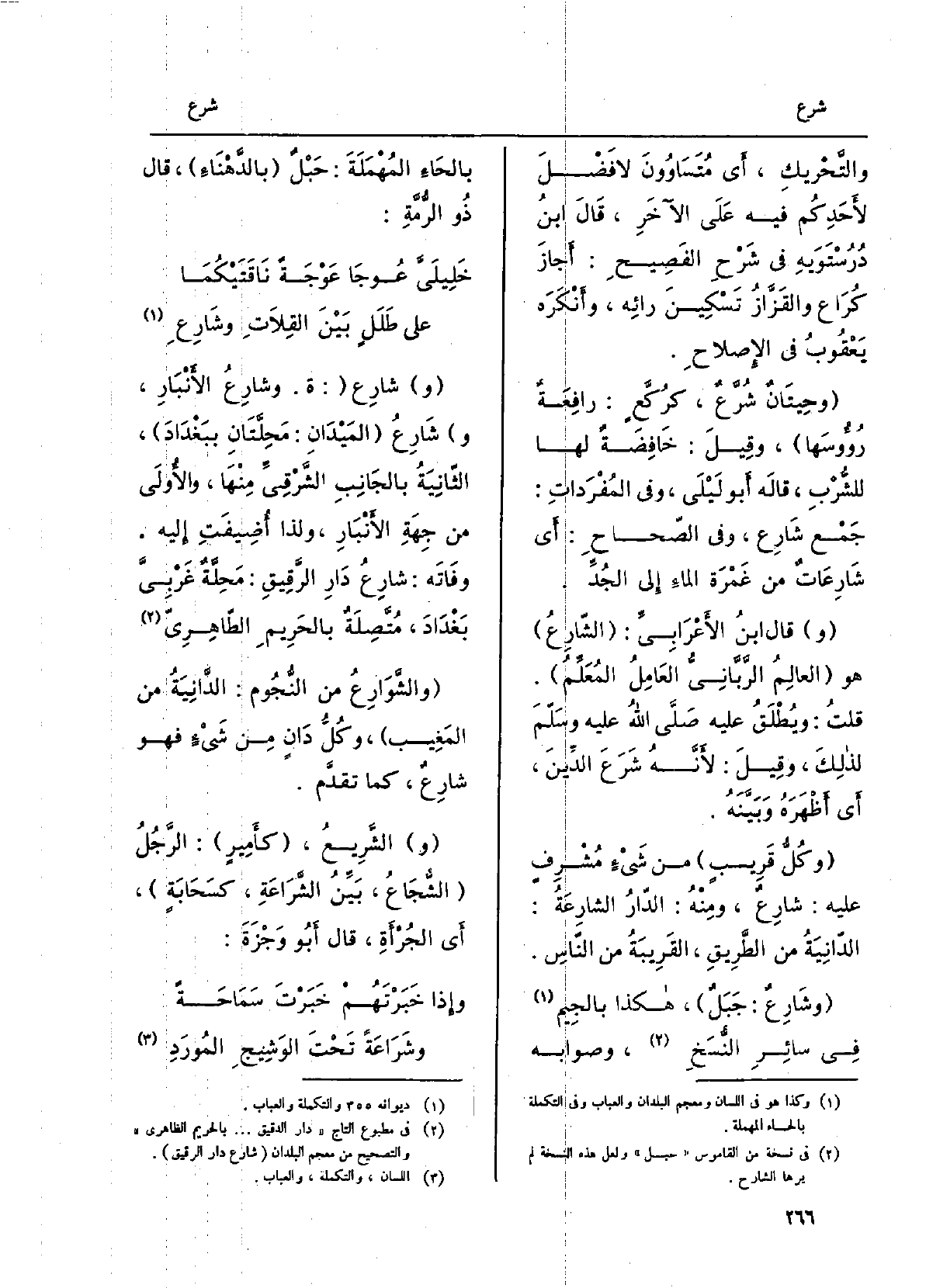 شارِع: ة. وشارِعُ الأَنْبار، وشارِعُ المَيْدان: محَلَّتانِ بِبَغْدَاد، الثانيةُ بالجانبِ الشَّرقيِّ مِنْهَا، والأُولى من جهةِ الأنبار، وَلذَا أُضيفَت إِلَيْهِ. وفاتَه: شارِعُ دارِ الرَّقيق: مَحِلَّةٌ غَرْبِيَّ بَغْدَاد، مُتَّصِلَةٌ بالحَريم الطاهِرِيّ. والشَّوارِعُ من النُّجُوم: الدانيةُ من المَغيب، وكلُّ دانٍ من شيءٍ فَهُوَ شارِعٌ، كَمَا تقدّم. الشَّريع، كأميرٍ: الرجلُ الشُّجاع، بَيِّنُ الشَّراعَة، كَسَحَابةٍ، أَي الجُرْأَة، قَالَ أَبُو وَجْزَة: