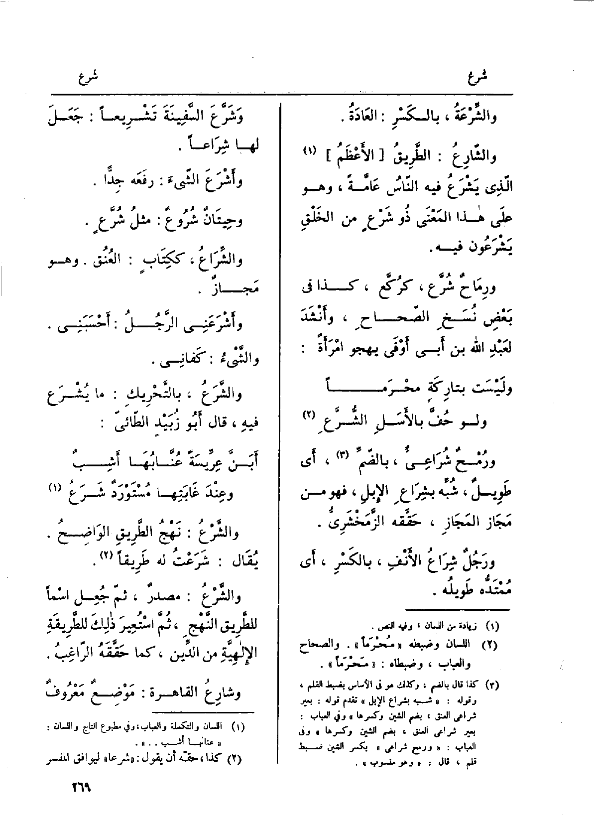 والشِّرْعَة، بالكَسْر: العادَة. والشّارِع: الطريقُ الأعظَم الَّذِي يَشْرَعُ فِيهِ الناسُ عامّةً، وَهُوَ على هَذَا الْمَعْنى ذُو شَرْعٍ من الخَلقِ يَشْرَعون فِيهِ. ورِماحٌ شُرَّع، كرُكَّع، كَذَا فِي بعضِ نسخ الصِّحَاح، وأنشدَ لعبدِ الله بن أبي أَوْفَى يهجو امْرَأَة: