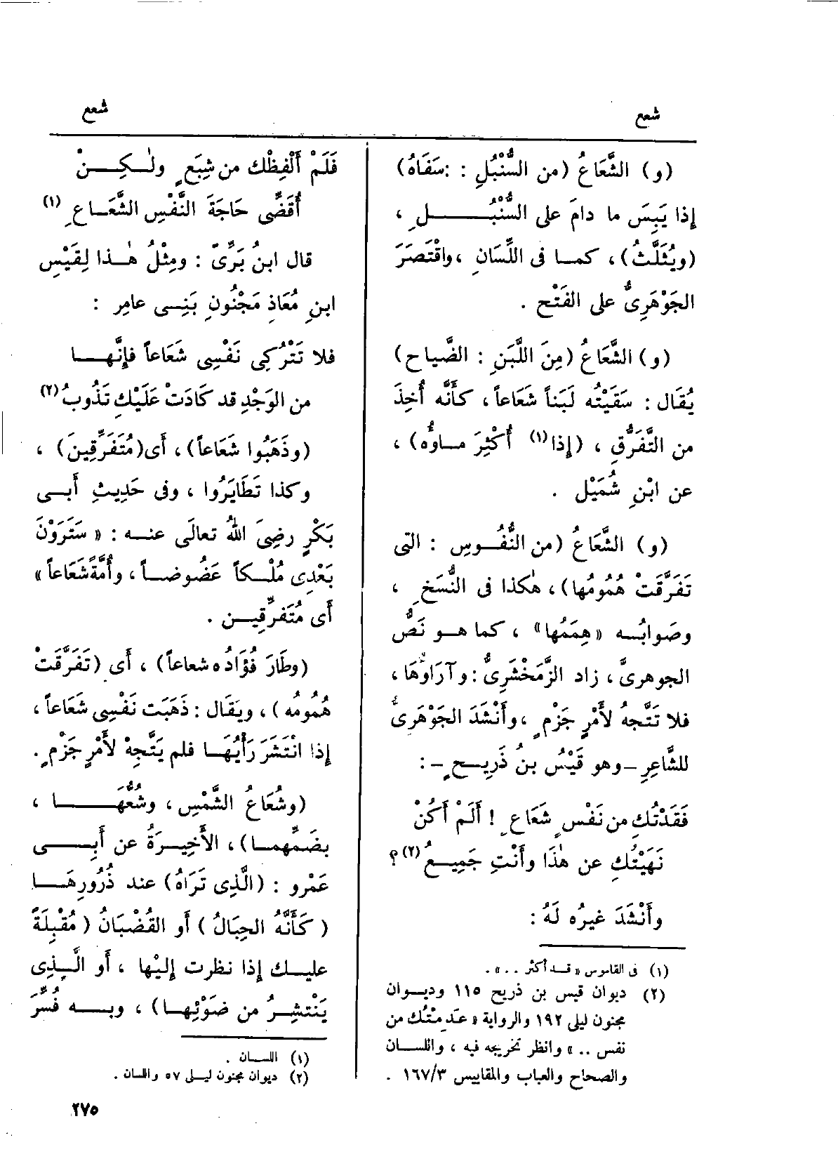 وذَهبوا شَعاعاً، أَي مُتفَرِّقين، وَكَذَا تَطايروا، وَفِي حديثِ أبي بكرٍ رَضِيَ الله تَعَالَى عَنهُ: سَتَرَوْنَ بَعْدِي مُلْكاً عَضوضاً، وأمَّةً شَعاعاً. أَي مُتفَرِّقين. وطارَ فُؤادُه شعاعاً، أَي تفرّقتْ هُمومُه، وَيُقَال: ذَهَبَتْ نَفْسِي شَعاعاً، إِذا انتشرَ رَأْيُها فَلم يتَّجِه لأمرٍ جَزمٍ. وشُعاعُ الشمسِ، وشُعُّها، بضمِّهما، الأخيرةُ عَن أبي عَمْرو: الَّذِي ترَاهُ عِنْد ذُرورِها كأنّه الحِبالُ أَو القُضبانُ مُقبِلَةً عَلَيْك إِذا نظرتَ إِلَيْهَا، أَو الَّذِي يَنْتَشِرُ من ضَوْئِها، وَبِه فُسِّرَ