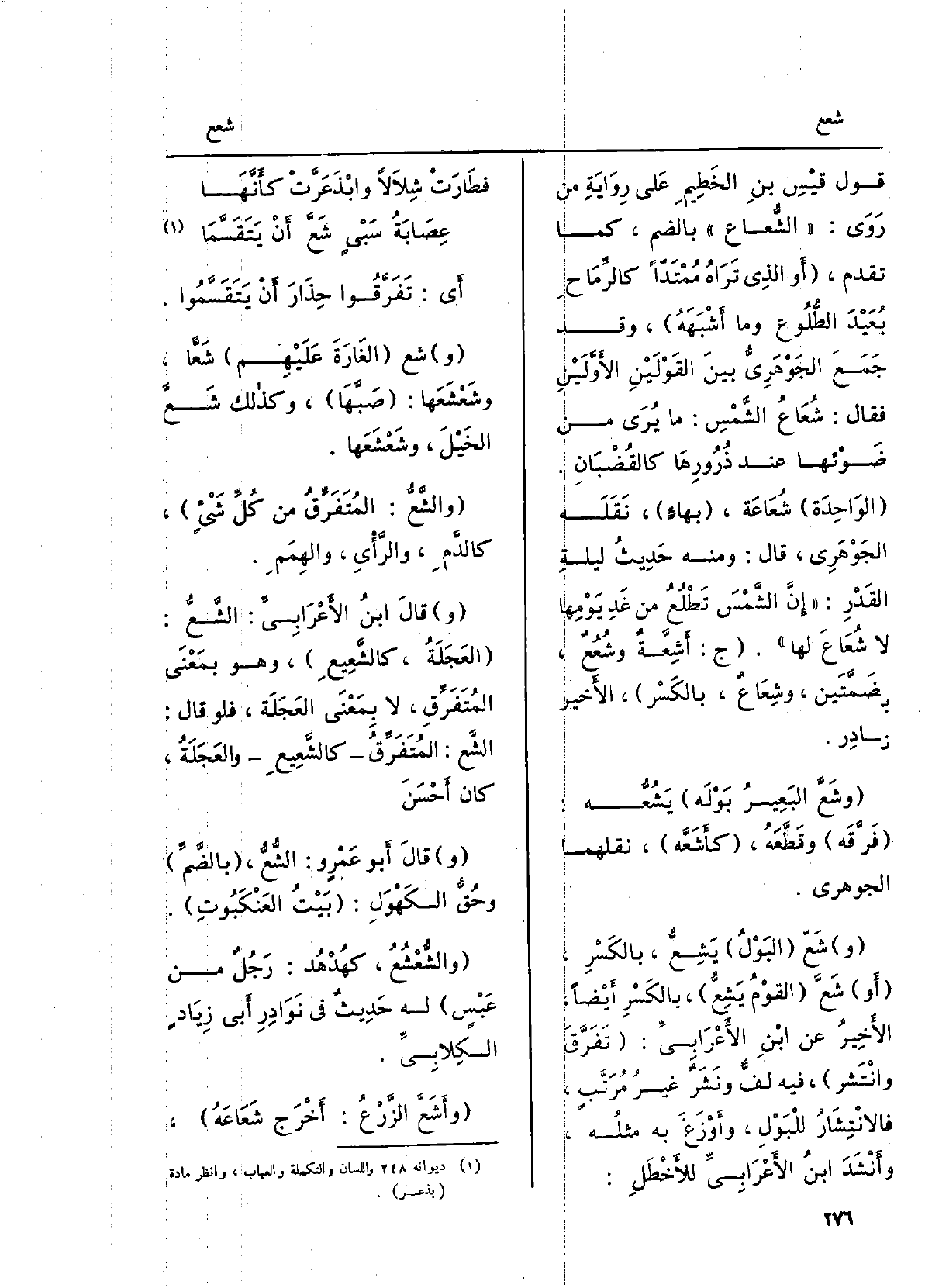 قولُ قيسِ بنِ الخَطيمِ على روايةِ من روى: الشُّعاع، بالضَّمّ، كَمَا تقدّم، أَو الَّذِي ترَاهُ مُمتَدّاً كالرِّماحِ بُعَيْدَ الطُّلوعِ وَمَا أَشْبَهه، وَقد جَمَعَ الجَوْهَرِيّ بَين القولَيْن الأوّلَيْنِ فَقَالَ: شُعاعُ الشَّمْس: مَا يُرى من ضَوْئِها عِنْد ذُرورِها كالقُضبان. الواحدةُ شُعاعَة، بهاءٍ، نَقَلَه الجَوْهَرِيّ، قَالَ: وَمِنْه حديثُ ليلةِ القَدْرِ: إنَّ الشمسَ تَطْلُعُ من غَدِ يَوْمِها لَا شُعاعَ لَهَا. ج: أَشِعَّةٌ وشُعُعٌ، بضمَّتَيْن، وشِعاعٌ، بالكَسْر، الأخيرُ نَادِر. وشَعَّ البعيرُ بَوْلَه يَشُعُّه: فرَّقَه وقطَّعَه، كأَشَعَّه، نقلهما الجَوْهَرِيّ. شَعَّ البَولُ يَشِعُّ، بالكَسْر، أَو شَعَّ القومُ يَشِعُّ، بالكَسْر أَيْضا، الأخيرُ عَن ابْن الأَعْرابِيّ: تفَرَّقَ وانتشرَ، فِيهِ لَفٌّ ونَشَرٌ غيرُ مُرَتَّبٍ، فالانتِشارُ للبَولِ، وأَوْزَغَ بِهِ مثلُه، وأنشدَ ابْن الأَعْرابِيّ للأخطَل: