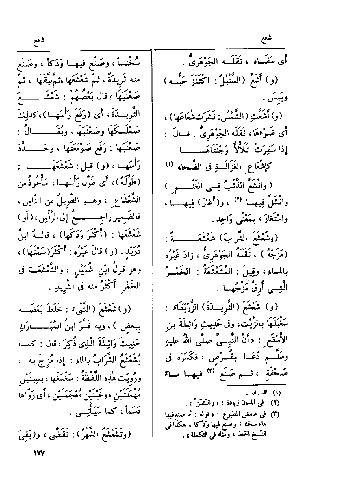 وانْشَعَّ الذئبُ فِي الغنَمِ وانْشَلَّ فِيهَا، وأغارَ فِيهَا، واسْتَغار، بِمَعْنى واحدٍ. وشَعْشَعَ الشَّرابَ شَعْشَعةً: مَزَجَه، نَقله الجَوْهَرِيّ، زادَ غَيْرُه بِالْمَاءِ، وَقيل: المُشَعْشَعَة: الخَمرُ الَّتِي أُرِقَّ مَزْجُها. شَعْشَع الثَّريدَةَ الزُّرَيْقاء: سَغْبَلها بالزيت، وَفِي حديثِ واثِلةَ بنِ الأَسْقَع: أنّ النبيَّ صلّى الله عَلَيْهِ وسلَّم دَعَا بقُرْصٍ، فَكَسَره فِي صَحْفَةٍ، ثمّ صَنَعَ فِيهَا مَاء سُخناً، وصَنَعَ فِيهَا وَدَكَاً، وصَنَعَ مِنْهُ ثَريدَةً، ثمّ شَعْشَعها، ثمّ لَبَّقَها، ثمّ صَعْنَبَها. قَالَ بَعْضُهم: شَعْشَعَ الثَّريدَةَ، أَي رَفَعَ رَأْسَها، كَذَلِك صَعْلَكَها وصَعْنَبَها، وَيُقَال: صَعْنَبَها: رَفَعَ صَوْمَعتَها، وحدَّدَ رَأْسَها، قيل: شَعْشَعَها: طَوَّلَه، أَي طوَّلَ رَأْسَها، مأخوذٌ من الشَّعشاع، وَهُوَ الطويلُ من النَّاس، فالضميرُ راجعٌ إِلَى الرأسِ، أَو شَعْشَعها: أَكْثَرَ وَدَكَها، قَالَه ابْن دُرَيْدٍ، قَالَ غيرُه: أَكْثَرَ سَمْنَها، وَهُوَ قولُ ابنِ شُمَيْلٍ، والشَّعْشَعَةُ فِي الخَمرِ أكثرُ مِنْهُ فِي الثَّرِيد. شَعْشَعَ الشيءَ: خَلَطَ بَعْضَه ببَعضٍ، وَبِه فَسَّرَ ابنُ المُبارَكِ حديثَ واثِلَةَ الَّذِي ذُكِرَ، قَالَ: كَمَا يُشَعْشَعُ الشرابُ بِالْمَاءِ: إِذا مُزِجَ بِهِ، ورُوِيَتْ هَذِه اللفظةُ: سَغْسَغَها، بسينَيْنِ مُهملَتَيْن، وغَيْنَيْن مُعجمتَيْن، أَي رَوّاها دَسَمَاً، كَمَا سَيَأْتِي. وتَشَعْشعَ الشَّهْرُ: تَقَضَّى، وبَقِيَ