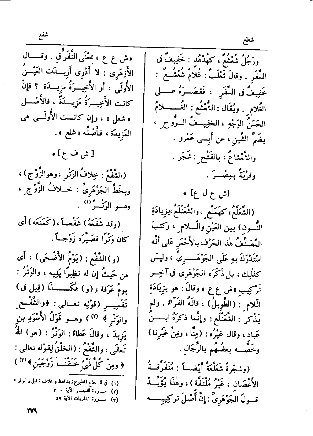 الشَّفْع: خِلافُ الوَتْرِ، وَهُوَ الزَّوْج، وبخطِّ الجَوْهَرِيّ: خلافُ الزَّوْج، وَهُوَ الوَتْر. وَقد شَفَعَه شَفْعَاً، كَمَنَعه أَي كَانَ وَتْرَاً فصَيَّرَه زَوْجَاً. الشَّفْع: يَوْمُ الْأَضْحَى، أَي من حيثُ إنّ لَهُ نَظيراً يَليه، والوَتْر: يومُ عَرَفَة، هَكَذَا قيل فِي تفسيرِ قَوْله تَعالى: والشَّفْعِ والوَتْرِ وَهُوَ قولُ الأسْوَدِ بنِ يَزيد، وَقَالَ عَطاءٌ: الوَتْر: هُوَ الله تَعَالَى، والشَّفْع: الخلقُ لقولِه تَعَالَى: ومِن كلِّ شيءٍ خَلَقْنا زَوْجَين