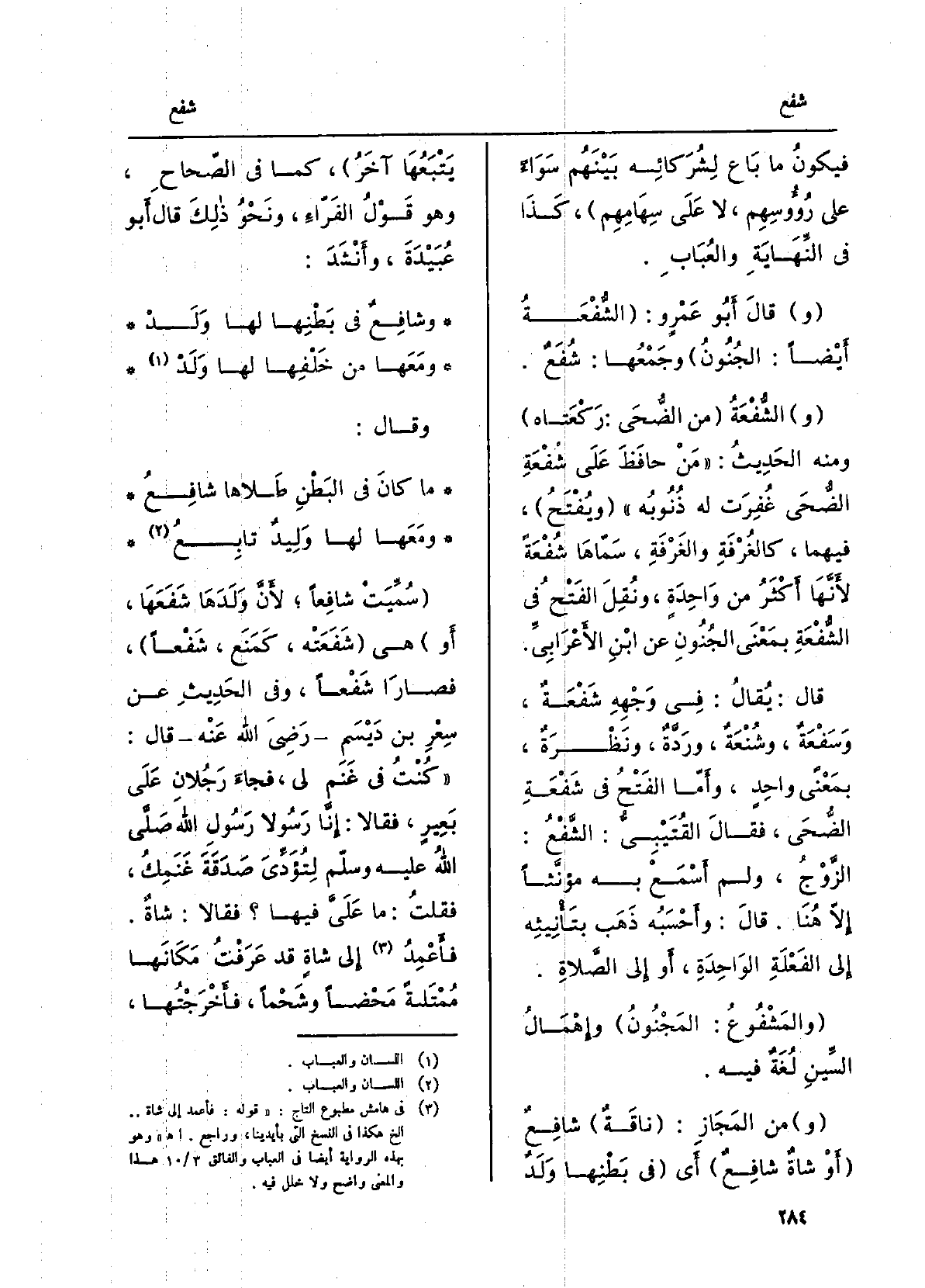 فَيكون مَا باعَ لشُرَكائِه بَينهم سَواءً على رؤوسِهم، لَا على سِهامِهم، كَذَا فِي النِّهايةِ والعُباب. قَالَ أَبُو عمروٍ: الشُّفْعَةُ أَيْضا: الجُنونُ وجَمْعُها: شُفَعٌ. الشُّفْعَةُ من الضُّحى: رَكْعَتاه وَمِنْه الحَدِيث: مَن حافَظَ على شَفْعَةِ الضُّحى غُفِرَتْ لَهُ ذُنوبُه ويُفتَح، فيهمَا، كالغُرفَةِ والغَرفَة، سَمّاها شُفْعَةً لأنّها أكثرُ من وَاحِدَة، ونُقِلَ الفتحُ فِي الشُّفْعَةِ بِمَعْنى الجُنونِ عَن ابْن الأَعْرابِيّ. قَالَ: يُقَال: فِي وَجْهِه شَفْعَةٌ، وسَفْعَةٌ، وشُنْعَةٌ، ورَدَّةٌ، ونَظْرَةٌ، بِمَعْنى واحدٍ، وأمّا الفَتحُ فِي شَفْعَةِ الضُّحى، فَقَالَ القُتَيْبيُّ: الشَّفْع: الزَّوْج، وَلم أَسْمَعْ بِهِ مُؤنَّثاً إلاّ هُنَا. قَالَ: وأَحْسَبُه) ذَهَبَ بتأنيثِه إِلَى الفَعلَةِ الواحدةِ، أَو إِلَى الصَّلَاة. والمَشْفوع: المَجنون وإهمالُ السينِ لغةٌ فِيهِ.