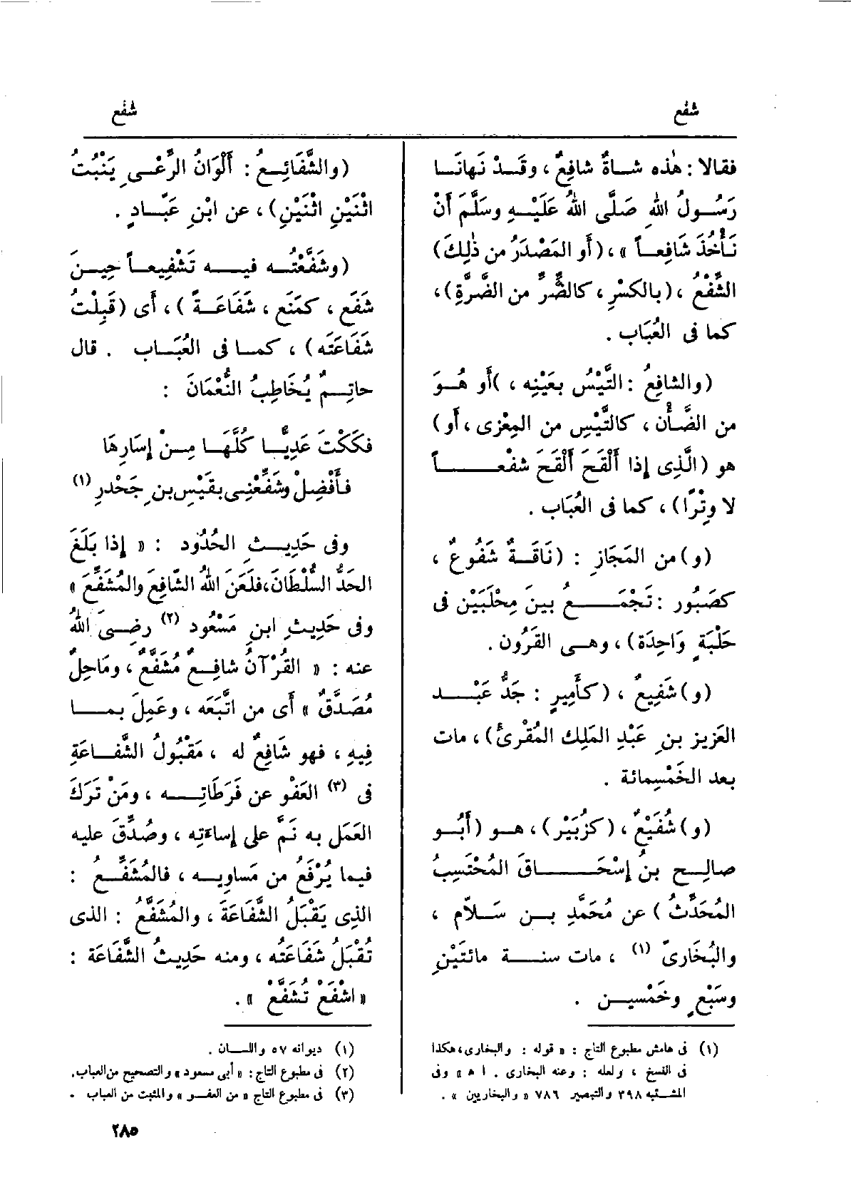 فَقَالَا: هَذِه شاةٌ شافِعٌ، وَقد نَهَانَا رسولُ الله صلّى الله عَلَيْهِ وسلَّم أنْ نَأْخُذَ شافِعاً. أَو المصدرُ من ذَلِك الشِّفْع، بالكَسْر، كالضِّرِّ من الضَّرَّة، كَمَا فِي العُباب. والشافِع: التَّيْسُ بعَينِه، أَو هُوَ من الضَّأْن، كالتَّيْسِ من المِعْزى، أَو هُوَ الَّذِي إِذا أَلْقَحَ أَلْقَح شَفْعَاً لَا وِتراً، كَمَا فِي العُباب. منَ المَجاز: ناقةٌ شَفوعٌ، كصَبورٍ: تَجْمَعُ بينَ مِحلَبَيْن فِي حَلْبَةٍ وَاحِدَة، وَهِي القَرون. شَفيعٌ، كأميرٍ: جَدُّ عبدِ الْعَزِيز بنِ عبدِ الملِك المُقرِئُ، مَاتَ بعد الْخَمْسمِائَةِ. شُفَيْعٌ، كزُبَيْرٍ، هُوَ أَبُو صالِح بنُ إسحاقَ المُحتَسِبُ المُحدِّث عَن محمدِ بنِ سَلام، والبُخاريّ، مَاتَ سنة مائتَيْن وسبعٍ وخَمسين. والشَّفائِع: أَلْوَانُ الرَّعْيِ يَنْبُتُ اثنَيْنِ اثنَيْن، عَن ابْن عَبَّادٍ. وشَفَّعْتُه فِيهِ تَشْفِيعاً حينَ شَفَعَ، كَمَنَعَ، شَفاعَةً، أَي قَبِلْتُ شَفاعَتَه، كَمَا فِي العُباب. قَالَ حاتمٌ يُخاطِبُ النعمانَ: