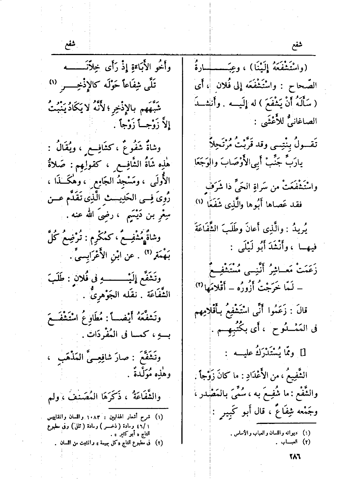 شبَّهَهم بالإذْخِر لأنّه لَا يكادُ يَنْبُتُ إلاّ زَوْجَاً زَوْجَا. وشاةٌ شَفوعٌ، كشافِعٍ، وَيُقَال: هَذِه شاةُ الشافِع، كقولِهم: صلاةُ الأُولى، ومَسجِدُ الجامِع، وَهَكَذَا، رُوِيَ فِي الحديثِ الَّذِي تقدّمَ عَن سِعرِ بنِ دَيْسَمٍ، رَضِيَ الله عَنهُ. وشاةٌ مُشْفِعٌ، كمُكرِم: تُرضِعُ كلَّ بَهْمَةٍ. عَن ابْن الأَعْرابِيّ. وَتَشَفَّعَ إِلَيْهِ فِي فلانٍ: طَلَبَ الشّفاعَةَ. نَقله الجَوْهَرِيّ. وَتَشَفَّعَه أَيْضا: مُطاوِعُ اسْتَشْفَعَ بِهِ، كَمَا فِي المُفردات. وَتَشَفَّعَ: صارَ شافعِيَّ المَذهَب، وَهَذِه مُوَلَّدةٌ. والشَّفاعَة، ذكرهَا المُصَنِّف، وَلم