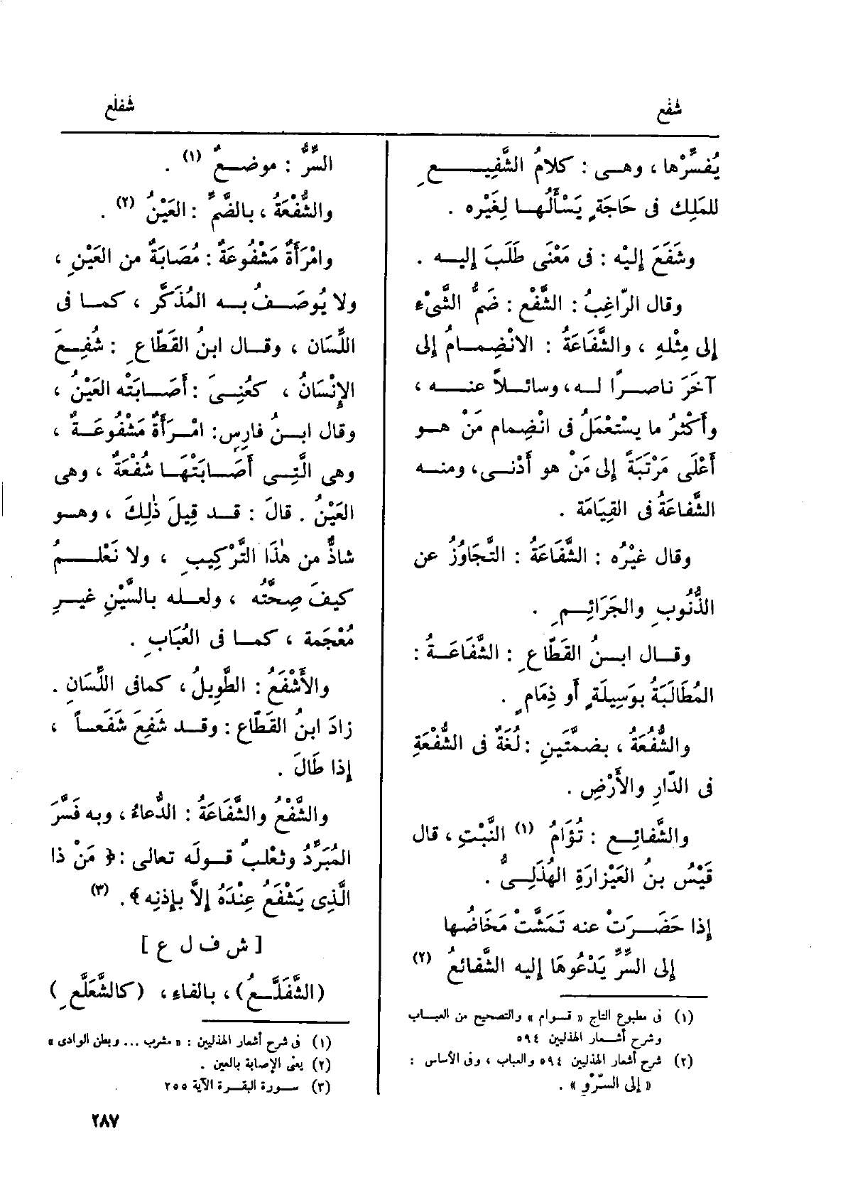 وَقَالَ الرَّاغِب: الشَّفْع: ضَمُّ الشيءِ إِلَى مِثلِه، والشّفاعَة: الانضِمامُ إِلَى آخَرَ ناصراً لَهُ، وسائلاً عَنهُ، وأكثرُ مَا يُستعمَلُ فِي انضِمامِ مَن هُوَ أَعلَى مَرْتَبةً إِلَى من هُوَ أدنى، وَمِنْه الشَّفاعَةُ فِي الْقِيَامَة. وَقَالَ غيرُه: الشَّفاعَة: التَّجاوُزُ عَن الذُّنوبِ والجرائم. وَقَالَ ابنُ القَطّاع: الشّفاعَةُ: المُطالَبةُ بوَسيلةٍ أَو ذِمامٍ. والشُّفُعَةُ، بضمَّتَيْن: لغةٌ فِي الشُّفْعَةِ فِي الدارِ وَالْأَرْض. والشّفائِع: تُؤَام النبتِ، قَالَ قَيْسُ بنُ العَيْزارَةِ الهُذَلِيُّ: