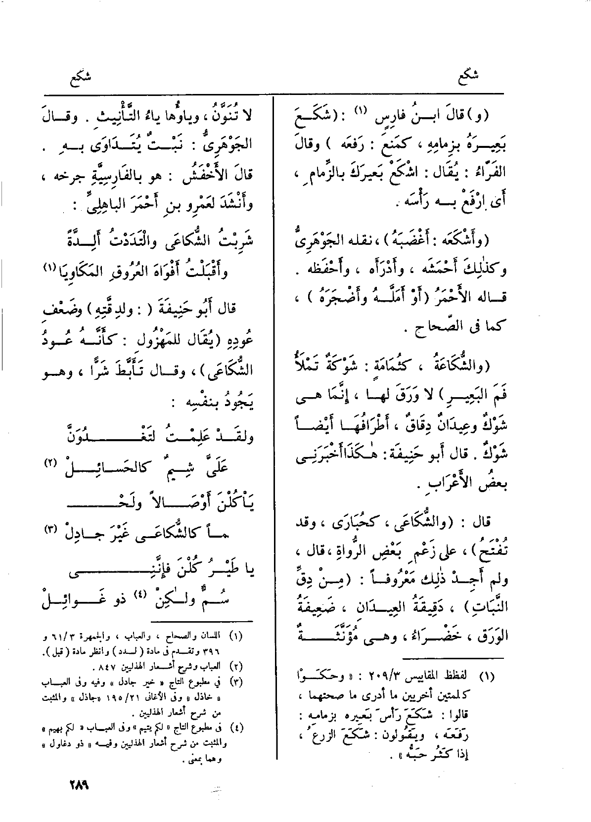 قَالَ ابنُ فارسٍ: شَكَعَ بَعيرَه بزِمامِه، كَمَنَع: رَفَعَه، وَقَالَ الفَرّاءُ: يُقَال: اشْكَعْ بَعيرَكَ بالزِّمامِ، أَي ارْفَعْ بِهِ رَأْسَه. وأَشْكَعَه: أَغْضَبَه، نَقله الجَوْهَرِيّ وَكَذَلِكَ أَحْمَشه، وأَدْرَأه، وأَحْفَظه. قَالَه الأحمرُ أَو أمَلَّه وأَضْجَرَه، كَمَا فِي الصِّحَاح. والشُّكاعَة، كثُمامةٍ: شَوْكَةٌ تملأُ فمَ البعيرِ لَا وَرَقَ لَهَا، إنّما هِيَ شَوْكٌ وعِيدانٌ دِقاقٌ، أطرافُها أَيْضا شوكٌ. قَالَ أَبُو حنيفةَ: هَكَذَا أَخْبَرني بعضُ الأَعراب. قَالَ: والشُّكاعَى، كحُبارى، وَقد تُفتَح، على زعمِ بعضِ الرُّواةِ، قَالَ: وَلم أَجِدْ ذَلِك مَعْرُوفاً: من دِقِّ النَّبَات، دَقيقَةُ العِيدانِ، ضعيفةُ الورَق، خَضْرَاء، وَهِي مُؤَنَّثةٌ لَا تُنوَّن، وياؤُها ياءُ التَّأْنِيث. وَقَالَ الجَوْهَرِيّ: نَبْتٌ يُتَداوى بِهِ. قَالَ الأخفَشُ: هُوَ بالفارسيّةِ جرخه، وأنشدَ لعمرِو بنِ أحمرَ الباهليِّ: