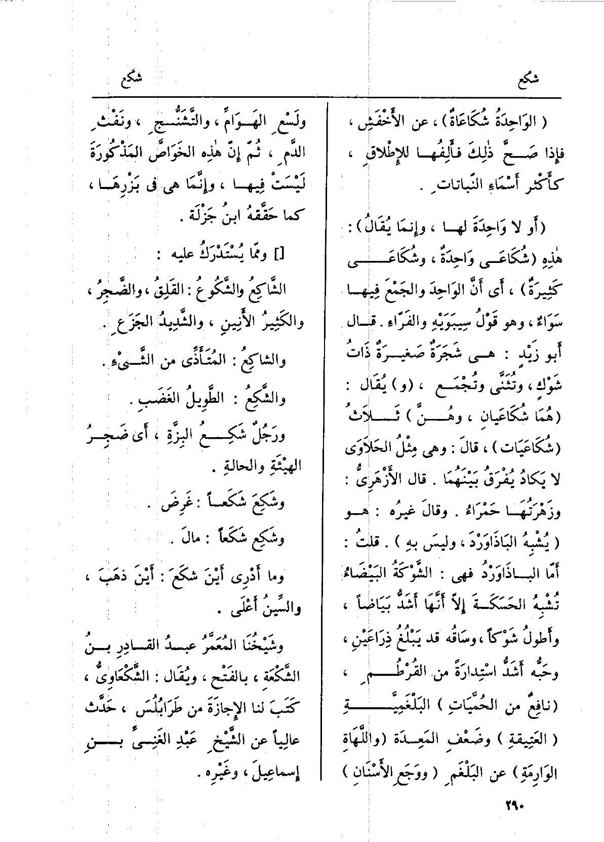 الواحدةُ شُكاعاة، عَن الْأَخْفَش، فَإِذا صَحَّ ذَلِك فألِفُها للإطلاق، كأكثرَ أسماءِ النباتات. أَو لَا واحدةَ لَهَا، وإنّما يُقَال: هَذِه شُكاعى واحدةٌ، وشُكاعى كثيرةٌ، أَي أنّ الواحدَ والجَمعَ فِيهَا سَواءٌ، وَهُوَ قولُ سِيبَوَيْهٍ والفَرّاء. قَالَ أَبُو زيدٍ: هِيَ شجرةٌ صغيرةٌ ذاتُ شَوكٍ، وتُثَنَّى وتُجمَع، يُقَال: هما شُكاعَيان، وهُنَّ ثلاثُ شُكاعَيَات، قَالَ: وَهِي مِثلُ الحَلاوَى لَا يكادُ يُفرَقُ بينهُما. قَالَ الأَزْهَرِيّ: وزَهرَتُها حَمْرَاء. وَقَالَ غيرُه: هُوَ يُشبَهُ الباذاوَرْد فَهِيَ: الشوكةُ البيضاءُ تُشبِهُ الحَسَكةَ إلاّ أنّها أشَدُّ بَياضاً، وأطولُ شَوْكَاً، وساقُه قد يَبْلُغُ ذِراعَيْن، وحَبُّه أشدُّ استِدارَةً من القُرطُم، نافِعٌ من الحُمَّيَات البَلْغَمِيَّةِ العَتيقَةِ وضَعفِ المَعِدَةِ واللَّهاةِ الوارِمَةِ عَن البَلغَمِ ووَجعِ الأَسْنانِ ولَسْعِ الهَوامِّ، والتَّشَنُّج، ونَفْثِ الدَّم، ثمّ إنّ هَذِه الخَواصَّ المذكورةَ ليستْ فِيهَا، وإنّما هِيَ فِي بَزْرِها، كَمَا حقَّقَه ابنُ جَزْلَةَ. ومِمّا يُسْتَدْرَك عَلَيْهِ: الشّاكِعُ والشَّكُوع: القَلِقُ، والضَّجِرُ، والكثيرُ الأَنينِ، والشديدُ الجزَع. والشاكِع: المُتَأَذِّي من الشيءِ. والشَّكِع: الطويلُ الغضَب.