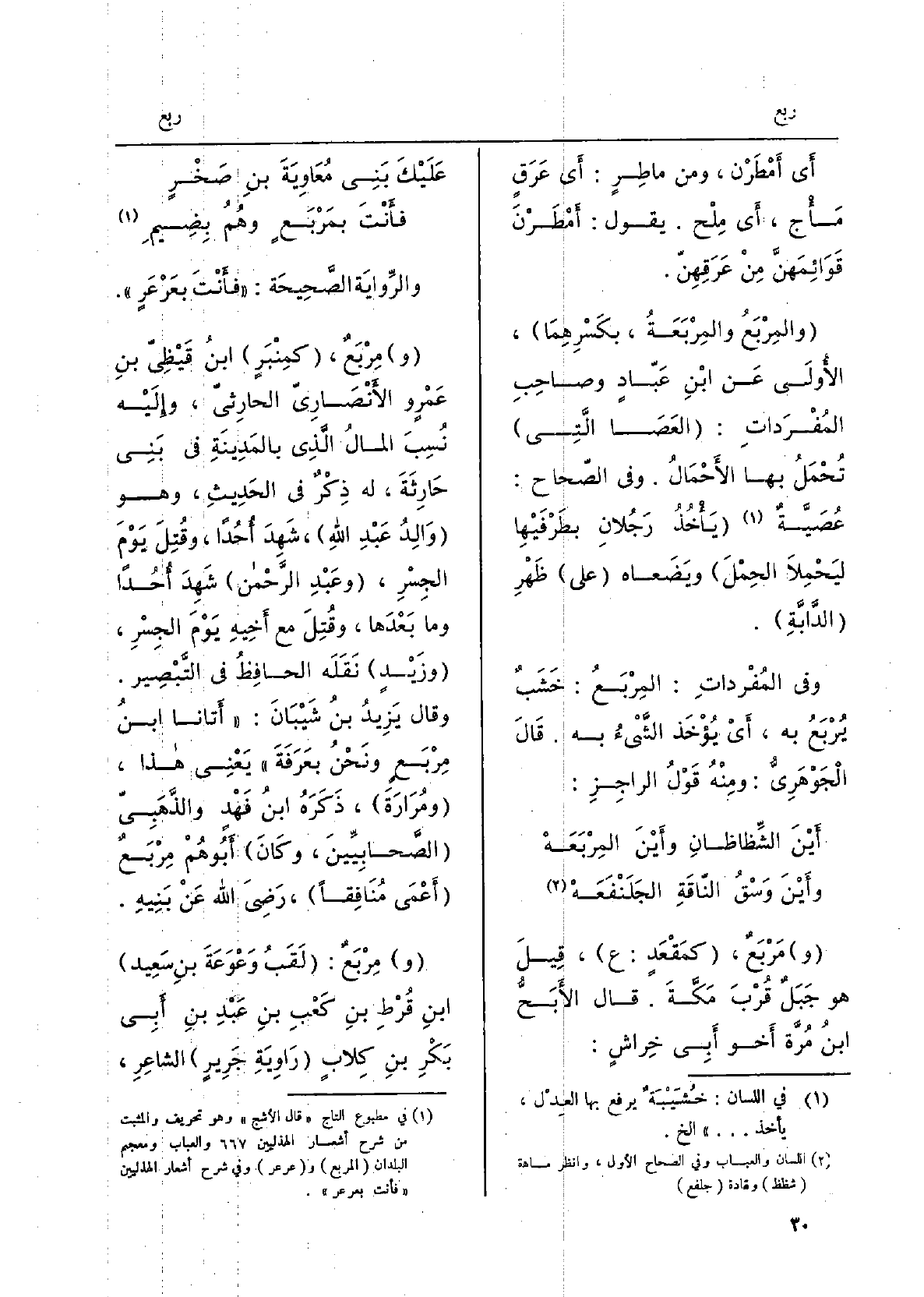 والرِّوايةُ الصَّحِيحَة: فَأَنْتَ بعَرْعَرٍ. مِرْبَع، كمِنْبَرٍ بنُ قَيْظِيّ بنِ عمروٍ الأنصاريّ الحارثيّ، وَإِلَيْهِ نُسِبَ المالُ الَّذِي بالمدينةِ فِي بَني حارِثَة، لَهُ ذِكرٌ فِي الحَدِيث، وَهُوَ والِدُ عَبْد الله، شَهِدَ أُحُداً، وقُتِلَ يومَ الجِسْر، وعبدِ الرَّحْمَن شَهِدَ أُحُداً وَمَا بَعْدَها، وقُتِلَ مَعَ أخيهِ يومَ الجِسْرِ، وزَيدٍ نَقَلَه الحافظُ فِي التبصير. وَقَالَ يَزيدُ بنُ شَيْبَان: أَتَانَا ابنُ مِرْبَعٍ ونحنُ بعَرَفَةَ. يَعْنِي هَذَا، ومُرَارَة، ذَكَرَه ابنُ فَهْدٍ والذَّهَبيّ الصَّحابِيِّين، وَكَانَ أبوهم مِرْبَعٌ أَعْمَى مُنافِقاً، رَضِيَ الله عَن) بَنيه. مِرْبَع: لقَبُ وَعْوَعَةَ بنِ سعيد بنِ قُرْطِ بنِ كَعْبِ بنِ عَبْدِ بن أبي بَكْرِ بنِ كِلاب روايةِ جَريرٍ الشَّاعِر،