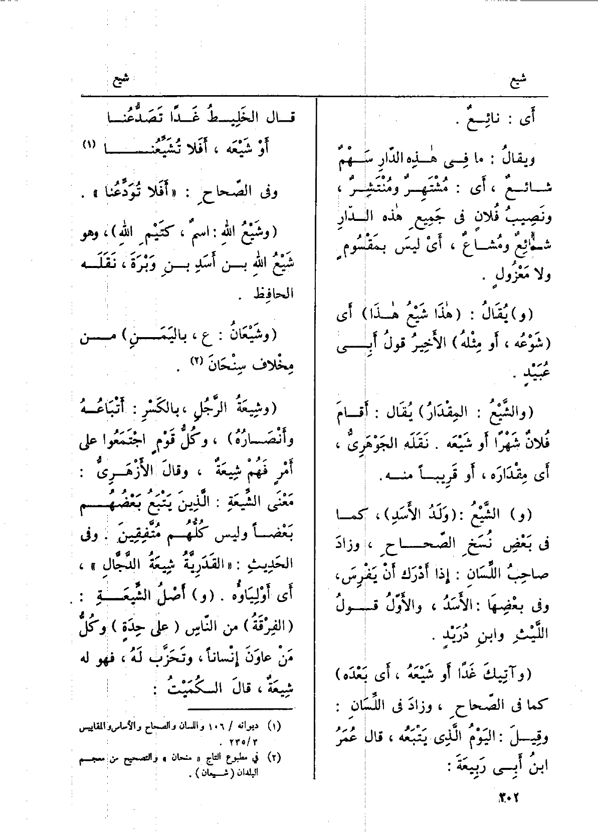 وَفِي الصِّحاح: أَفلا تُوَدِّعُنا.} وشَيْعُ اللهِ: اسمٌ، كتَيْمِ اللهِ، وَهُوَ شَيْعُ الله بن أَسَدِ بن وَبْرَة، نَقله الْحَافِظ. {وشَيْعانُ: ع، باليَمَنِ، من مِخلاف سِنْحانَ.} وشِيعَةُ الرَّجُلِ، بالكسْرِ: أَتباعُه وأَنصارُه، وكُلُّ قومٍ اجْتَمعُوا على أَمْرٍ فهُم {شِيعَةٌ، وَقَالَ الأَزْهَرِيّ: مَعنى} الشِّيعَةِ: الَّذين يتبعُ بعضُهُم بَعضاً وَلَيْسَ كلُّهُم مُتَّفقينَ. وَفِي الحديثِ: القَدَرِيَّةُ شِيعَةُ الدَّجَّالِ، أَي أَولِياؤُه. أصلُ الشِّيعَةِ: الفِرْقَةُ من النّاسِ على حِدَةٍ، وكلُّ مَن عاوَنَ إنْسَانا وتَحَزَّبَ لَهُ فَهُوَ لَهُ شيعةٌ، قَالَ الكُمَيْتُ: