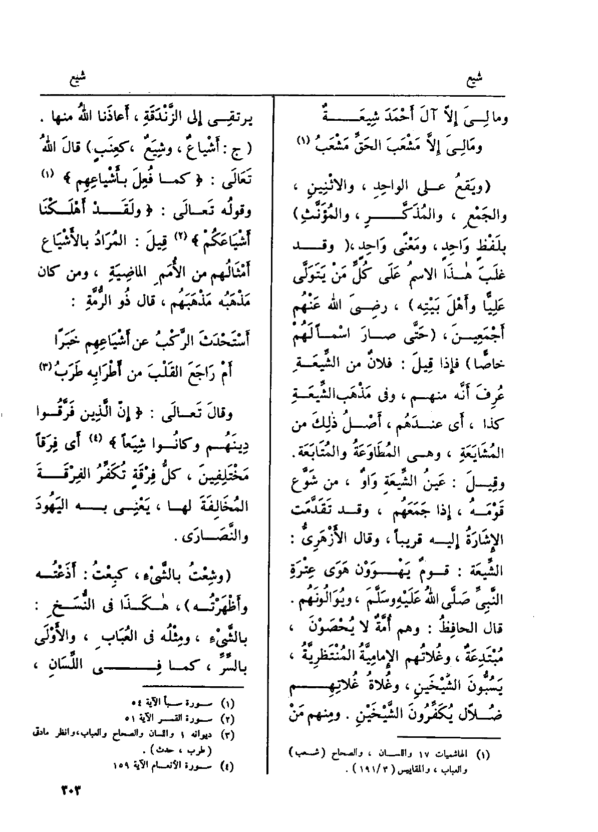 ويقعُ على الواحدِ، والاثنينِ، والجَمعِ، والمُذَكَّرِ، والمؤنَّثِ، بلفظٍ واحِدٍ، وَمعنى واحِدٍ. وَقد غلَبَ هَذَا الاسمُ على كلِّ مَن يَتولَّى عَلِيّاً وأَهل بيتِه، رَضِي الله عَنْهُم أَجمعينَ، حتّى صارَ اسْما لهُم خاصّاً، فَإِذا قيلَ: فلانٌ من الشِّيعَةِ عُرِفَ أَنَّه مِنْهُم، وَفِي مَذهب الشيعَةِ كَذَا، أَي عندَهم، أَصلُ ذلكَ من {المُشايَعَةِ، وَهِي المُطاوَعَةُ والمُتابَعَةُ. وَقيل: عَيْنُ الشِّيعَةِ واوٌ، مِن شَوَّعَ قومَهُ، إِذا جمعَهُم، وَقد تقدَّمت الإشارَةُ إِلَيْهِ قَرِيبا، وَقَالَ الأَزْهَرِيّ: الشِّيعَة: قَوْمٌ يَهْوَوْنَ هَوَى عِتْرَةِ النَّبيِّ صلّى الله عَلَيْهِ وسلَّم، ويُوالونَهُم. قَالَ الحافظُ: وهم أُمَّةٌ لَا يُحْصَوْنَ، مُبتدِعَةٌ، وغُلاتُهم الإماميَّةُ المُنتظِرِيَّةُ، يَسُبُّونَ الشَّيخَينِ، وغُلاةُ غُلاتِهِم ضُلاّلٌ يُكَفِّرونَ الشَّيخين، وَمِنْهُم من يرتَقي إِلَى الزَّندَقَةِ، أَعاذَنا الله مِنْهَا. ج:} أَشياعُ {وشِيَعٌ، كعِنَبٍ، قَالَ الله تَعَالَى: كَمَا فُعِلَ} بأَشياعِهِم وقولُه تَعَالَى: ولَقَد أَهلَكْنا {أَشْياعَكُمْ قيل: المُراد} بالأَشياعِ أَمثالُهُم مِمَّن الأُمَمِ الماضيَةِ، ومَن كانَ مَذهبه مَذْهَبهم، قَالَ ذُو الرُّمَّةِ: