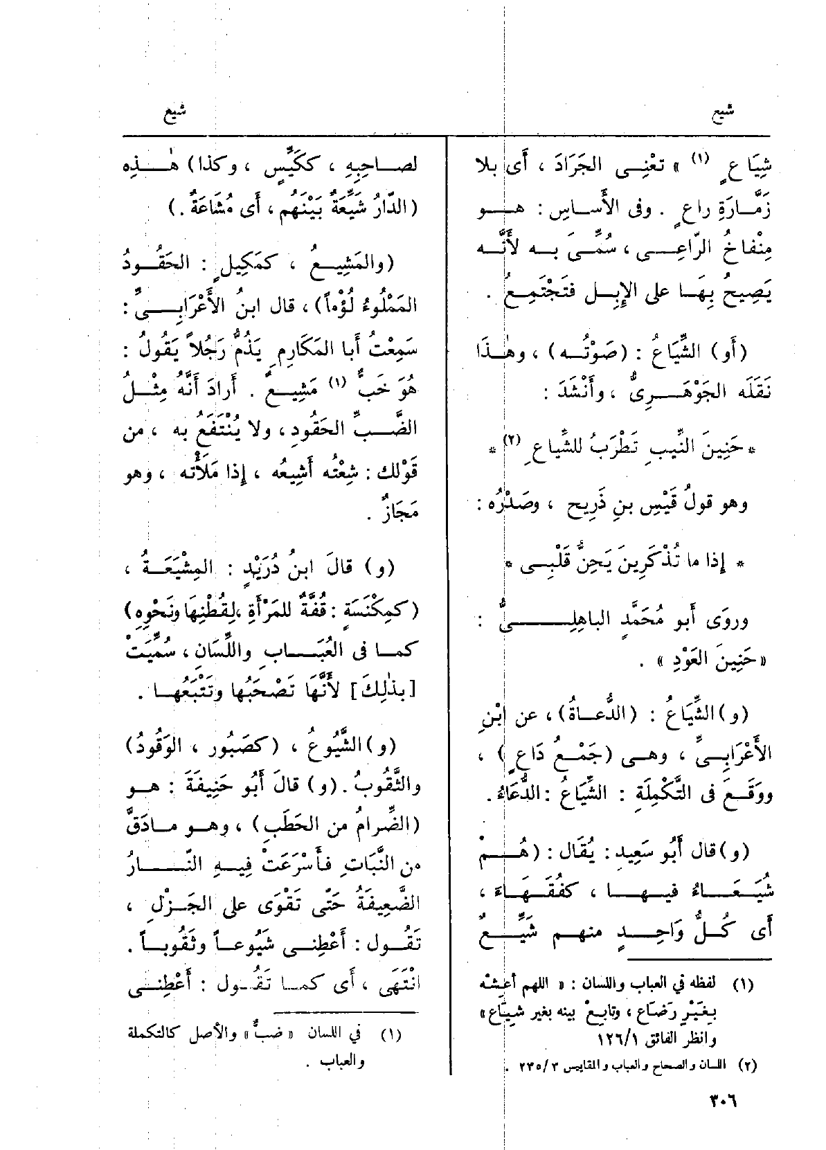 {شياعٍ، َعني الجَرادَ، أَي بِلَا زَمّارَةِ راعٍ. وَفِي الأَساسِ: هُوَ مِنفاخُ الرَّاعي، سُمِّيَ بِهِ لأَنَّه يَصيحُ بهَا على الإبِلِ فتَجتَمِعُ. الشِّياعُ: صوتُه، وَهَذَا نَقله الجَوْهَرِيُّ، وأَنشدَ: حَنينَ النِّيبِ تَطرَبُ} للشِّياعِ وَهُوَ قَول قيس بنِ ذَريح، وصدرُه: إِذا مَا تُذْكَرينَ يَحِنُّ قَلبي وروى أَبو محمّدٍ الباهِلِيُّ: حَنينَ العودِ. الشِّياعُ: الدُّعاةُ، عَن ابنِ الأَعرابيِّ، وَهِي جَمعُ داعٍ، ووقعَ فِي التَّكملَةِ: الشِّياعُ: الدُّعاءُ. قَالَ أَبو سعيدٍ: يُقال: هُمْ {شُيَعاءُ فِيهَا، كفُقَهاءَ، أَي كلُّ واحِدٍ مِنْهُم} شَيِّعٌ لصاحبِه، ككَيِّسٍ، وَكَذَا هَذِه الدَّارُ {شَيِّعَةٌ بينَهُم، أَي} مُشاعَةٌ. {والمَشيعُ، كمَكيلٍ: الحَقودُ المَملوءُ لُؤماً، قَالَ ابنُ الأَعرابيِّ: سَمعتُ أَبا المَكارِمِ يَذُمُّ رَجُلاً يَقولُ: هُوَ خَبٌّ} مَشيعٌ، أَرادَ أَنَّه مثلُ الضَّبِّ الحَقودِ، وَلَا يُنتفَعُ بِهِ، من قولِكَ: {شعْتُهُ} أَشيعُه، إِذا ملأْته، وَهُوَ مَجازٌ. قَالَ ابنُ دُريدٍ: {المِشْيَعَةُ، كمِكْنَسَةٍ: قُفَّةٌ للمرأَةِ، لِقُطْنِها ونَحوِه، كَمَا فِي العُباب وَاللِّسَان، سُمِّيَت بذلك لأَنَّها تصحَبُها وتتْبَعُها. (و) } الشَّيوعُ، كصَبور، الوَقودُ والثَّقوبُ. قَالَ أَبو حنيفَةَ: هُوَ الضِّرامُ من الحَطَبِ، وَهُوَ مَا دَقَّ من النَّباتِ فأَسرعَت فِيهِ النّارُ الضَّعيفَةُ حتّى تَقوَى على الجَزْلِ، تَقولُ: أَعطِني! شَيوعاً وثَقوباً. انْتهى، أَي كَمَا تَقول: أَعطِني