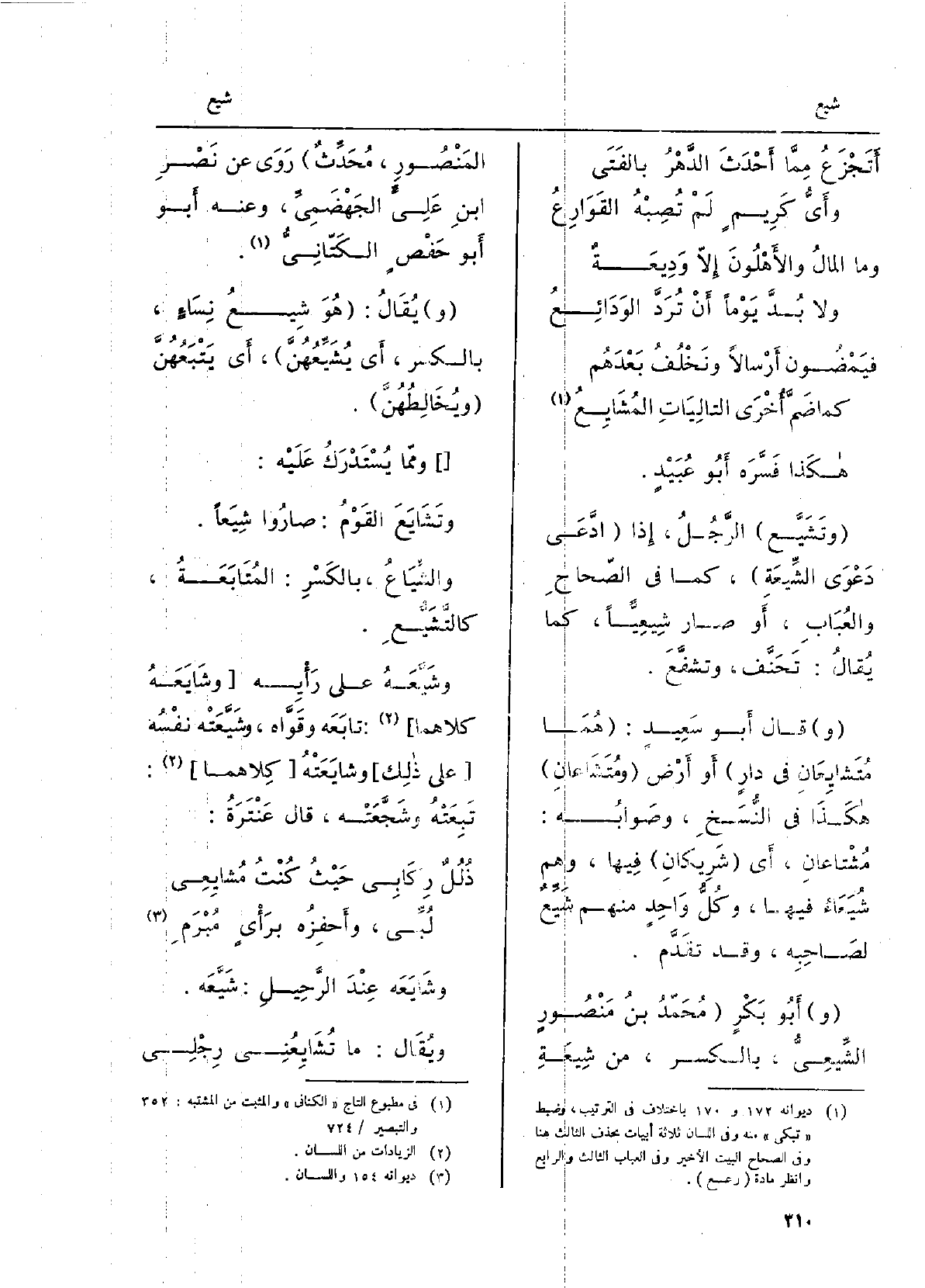 هَكَذَا فَسَّرَه أَبو عُبيدٍ. {وتَشَيَّعَ الرَّجُلُ: إِذا ادَّعَى دَعوى الشِّيعَةِ، كَمَا فِي الصِّحَاح والعباب، أَو صارَ} شِيعِيَّاً، كَمَا يُقَال: تَحَنَّفَ، وتَشَفَّعَ. قَالَ أَبو سعيدٍ: هما {مُتشايِعانِ فِي دارٍ أَو أَرضٍ} ومُتشاعانِ، هَكَذَا فِي النُّسَخ، وصوابُه: {مُشتاعانِ، أَي شَريكان فِيهَا، وهم} شُيَعاءُ فِيهَا، وكلُّ واحدٍ مِنْهُم {شَيِّعٌ لصاحِبِه، وَقد تقدَّم. أَبو بَكْرٍ محمّد بنُ مَنصورٍ} - الشِّيعِيُّ، بالكَسر، من شيعَةِ المَنصورِ، مُحَدِّثٌ روى عَن نَصرِ بنِ عليٍّ الجَهْضَمِيِّ، وَعنهُ أَبو حَفصٍ الكَتّانِيُّ. يُقَال: هُوَ {شِيعُ نِساءٍ، بالكَسر، أَي} يُشَيِّعُهُنَّ، أَي يَتْبَعُهُنَّ ويُخالِطُهُنَّ. وَمِمَّا يستدرَك عَلَيْهِ: {وتَشايَع القومُ: صَارُوا شِيَعاً،} والشِّياعُ، بالكَسر: المُتابَعَةُ، {كالتَّشَيُّعِ.} وشَيَّعَه على رأْيِه، {وشايعَه كِلَاهُمَا: تابعَه وقَوَّاه،} وشَيَّعَتْهُ نفسُه على ذلكَ {وشايَعَتْه كِلَاهُمَا: تَبِعَتْهُ وشَجَّعَتْه، قَالَ عنترةُ: