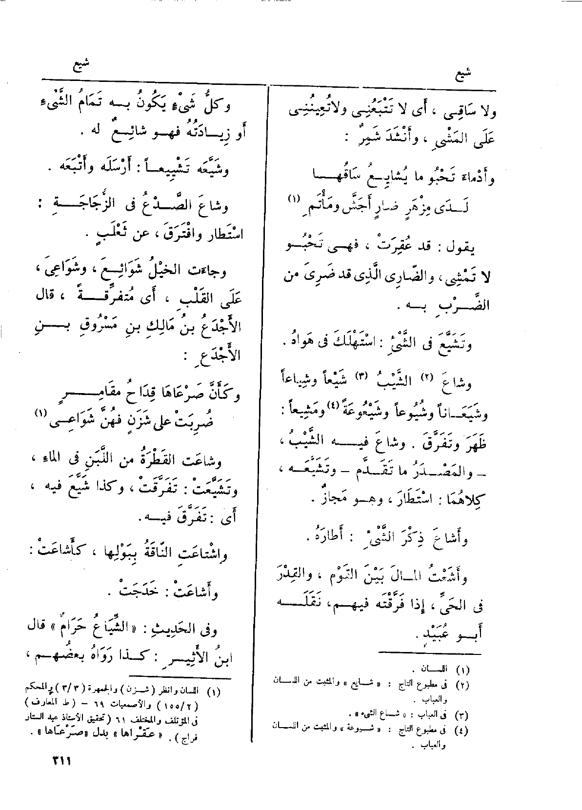 وكُلُّ شيءٍ يكونُ بِهِ تمامُ الشيءِ أَو زيادَتُهُ فَهُوَ شائعٌ لَهُ.} وشَيَّعَهُ {تَشيِيعاً: أَرسلَه وأَتبعَه. وشاعَ الصَّدعُ فِي الزُّجاجَةِ: استطارَ وافترَقَ، عَن ثعلَبٍ. وَجَاءَت الخيلُ} شَوائعَ، {- وشَواعِيَ، على القلبِ، أَي مُتَفَرِّقَةً، قَالَ الأَجدَعُ بنُ مالِكِ بنِ مَسروقِ بنِ الأَجدَعِ: