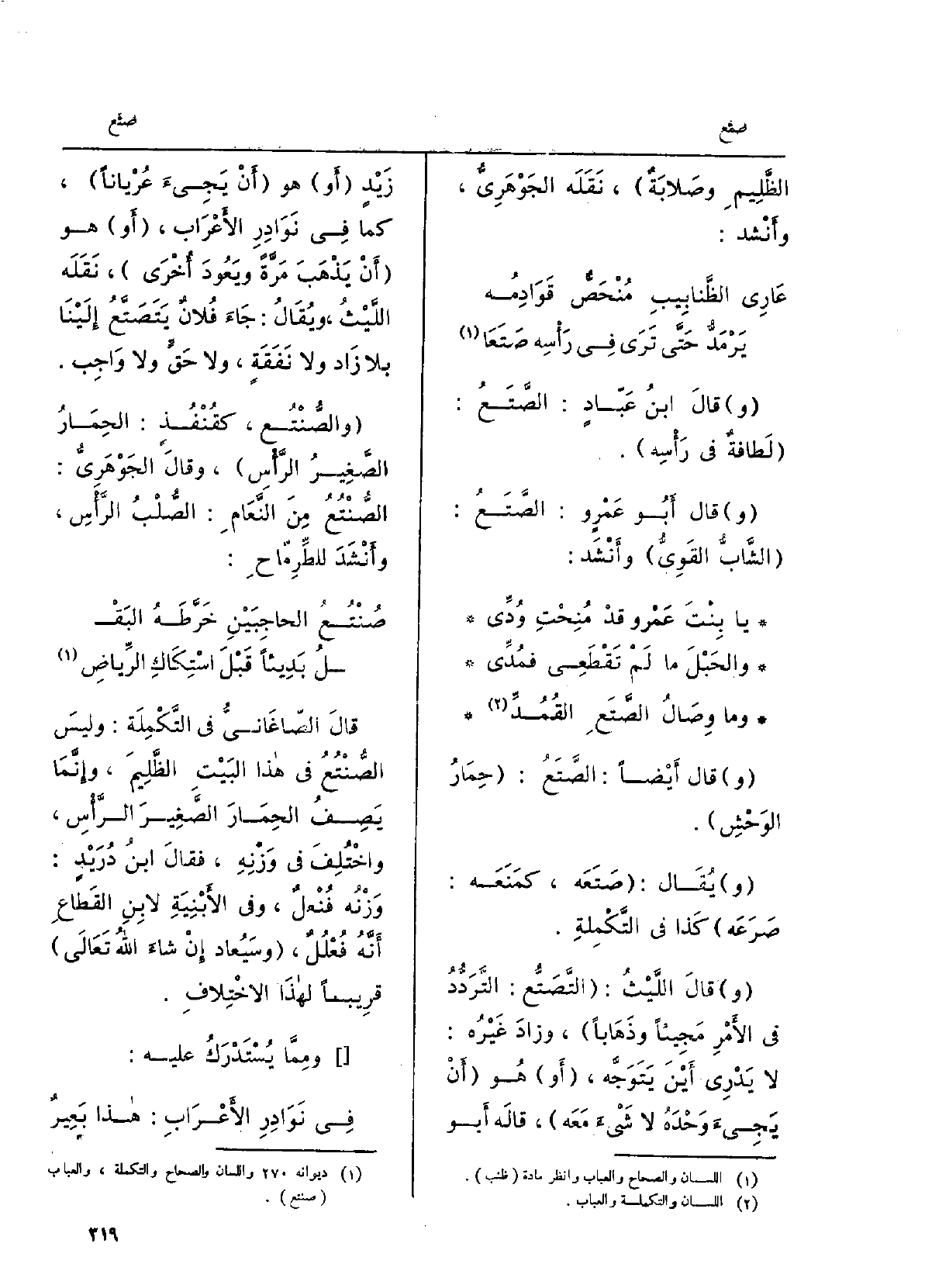 قَالَ الصَّاغانِيّ فِي التكملة: وَلَيْسَ الصُّنْتُع فِي هَذَا البيتِ الظَّليم، وإنّما يصفُ الحمارَ الصغيرَ الرأسِ، واختُلِفَ فِي وَزْنِه، فَقَالَ ابْن دُرَيْدٍ: وَزْنُه فُنْعُلٌ، وَفِي الأبنِيةِ لابنِ القَطّاعِ أنّه فُعْلُلٌ، وسيُعادُ إِن شَاءَ الله تَعالى قَرِيبا لهَذَا الِاخْتِلَاف. ومِمّا يُسْتَدْرَك عَلَيْهِ: فِي نوادرِ الأَعراب: هَذَا بعيرٌ