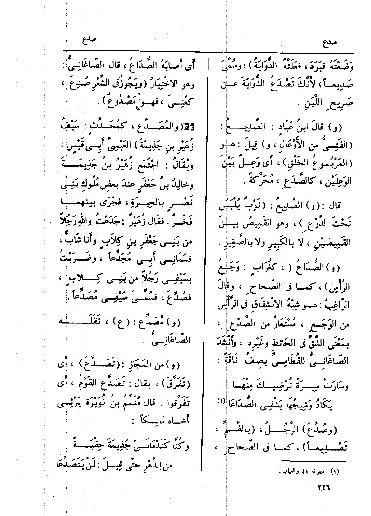 وَضَعْتَه فَبَرَدَ، فَعَلَتْهُ الدُّوَايَة، وسُمِّيَ صَديعاً لأنّك تَصْدَعُ الدُّوايةَ عَن صَريحِ اللبَن. قَالَ ابْن عَبَّادٍ: الصَّديع: الفَتِيُّ من الأوعال، وَقيل: هُوَ المَرْبوعُ الخَلقِ، أَي وَعِلٌ بَيْنَ الوَعِلَيْن، كالصَّدَع، محرّكةً. قَالَ: والصَّديع: ثوبٌ يُلبَسُ تحتَ الدِّرْع، وَهُوَ القَميصُ بَين القميصَيْن، لَا بالكبير وَلَا بالصغير. الصُّدَاع، كغُرابٍ: وَجَعُ الرَّأْس، كَمَا فِي الصِّحَاح، وَقَالَ الراغبُ: هُوَ شِبهُ الانشِقاقِ فِي الرأسِ من الوجَع، مُستَعارٌ من الصَّدْع، بِمَعْنى الشَّقِّ فِي الحائطِ وغيرِه، وأنشدَ الصَّاغانِيّ للقُطاميِّ يصفُ نَاقَة:)