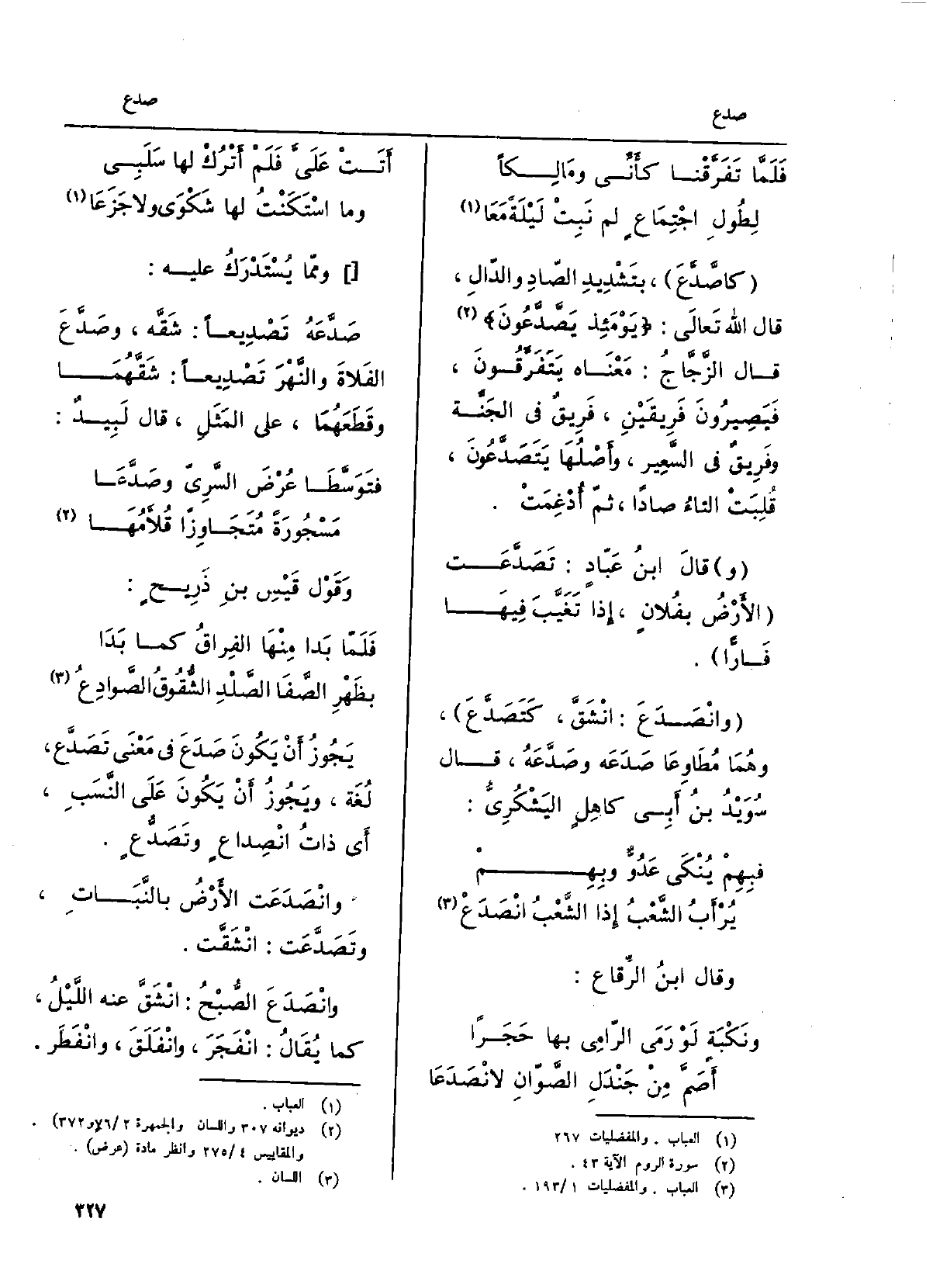 فلمّا تفَرَّقْنا كأنِّي ومالِكاً لطُولِ اجتِماعٍ لم نَبِتْ لَيْلَةً مَعَا كاصَّدَّعَ، بتشديدِ الصادِ وَالدَّال، قَالَ الله تَعالى: يَوْمَئِذٍ يَصَّدَّعون قَالَ الزَّجَّاج: مَعْنَاهُ يَتَفَرَّقون، فيَصيرون فريقَيْن، فريقٌ فِي الجَنّةِ وفريقٌ فِي السَّعير، وأصلُها يَتَصَدَّعون، قُلِبَتْ التَّاء صاداً، ثمّ أُدغِمَتْ. قَالَ ابْن عَبَّادٍ: تصَدَّعَت الأرضُ بفلانٍ، إِذا تغَيَّبَ فِيهَا فارّاً. وانْصَدَعَ: انْشَقَّ، كَتَصَدَّعَ، وهما مُطاوِعا صَدَعَه وصدَّعَه، قَالَ سُوَيْدُ بن أبي كاهِلٍ اليَشْكُريُّ: