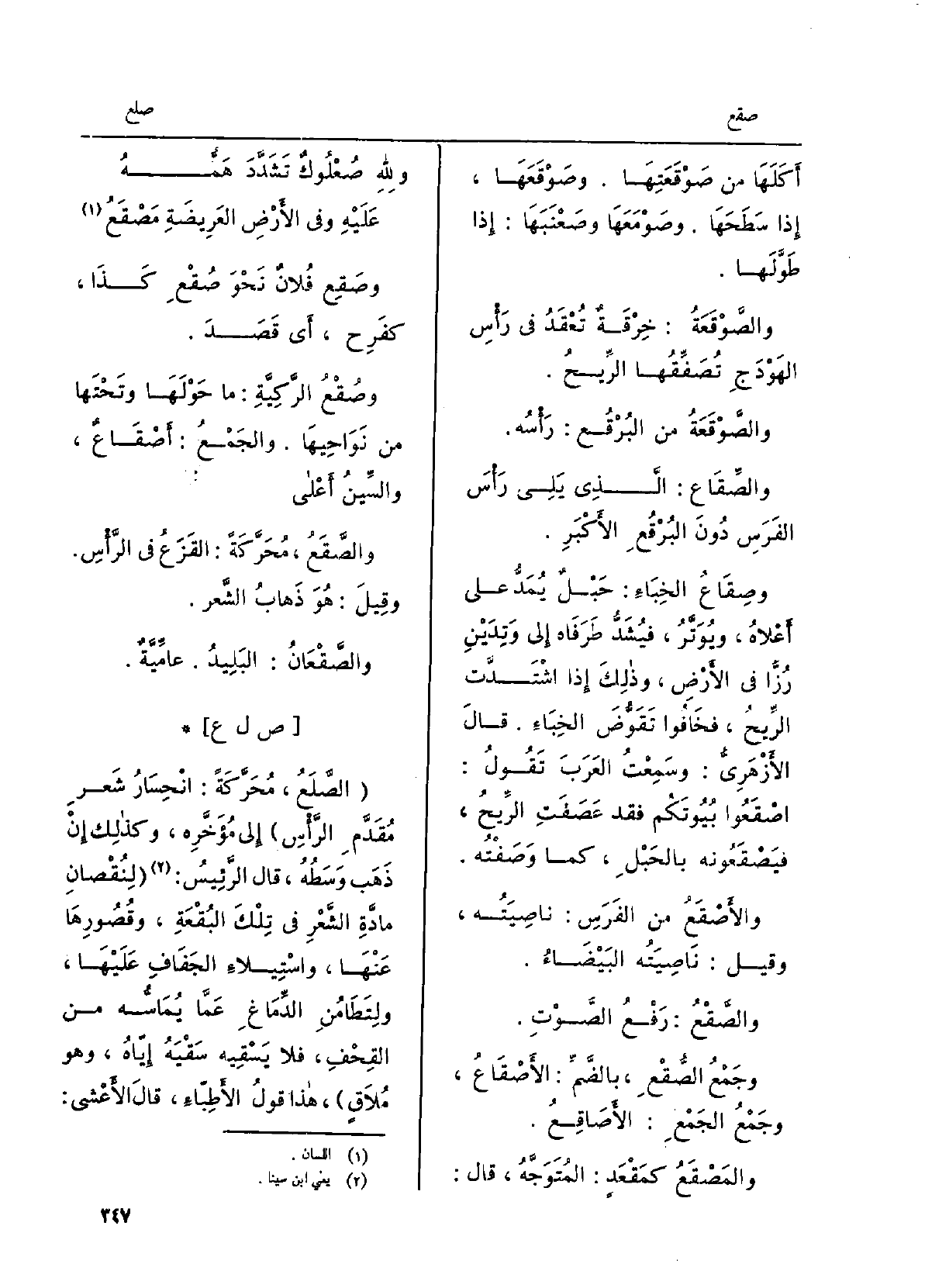 الصَّلَعُ، محركةً: انحِسارُ شعرِ مُقدَّمِ الرّأْسِ إِلَى مُؤَخَّرِه، وَكَذَلِكَ إِن ذهبَ وسَطهُ، قَالَ الرَّئيسُ: لِنُقصانِ مادَّةِ الشَّعْرِ فِي تلكَ البُقعَةِ، وقُصورِها عَنْهَا، واستيلاءِ الجَفافِ عَلَيْهَا، ولِتطامُنِ الدِّماغِ عمّا يُماسُّه من القِحْفِ، فَلَا يَسقيه سَقيَهُ إيّاهُ، وَهُوَ مُلاقٍ، هَذَا قولُ الأَطِبّاءِ، قَالَ الأَعشى: