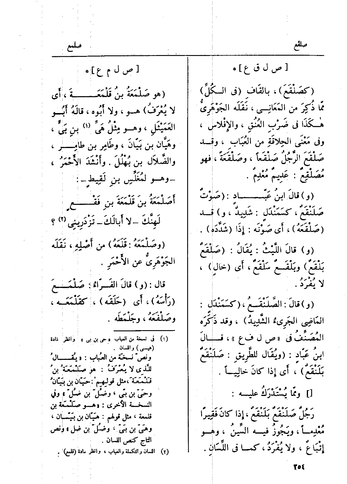 هُوَ صَلْمَعةُ بنُ قَلْمَعة، أَي لَا يُعرَفُ هُوَ، وَلَا أَبوهُ، قَالَه أَبُو العَمَيْثَل، وَهُوَ مِثلُ هَيِّ بنِ بَيِّ، وهَيَّان بن بَيَّان، وطامِرِ بن طامِر، والضَّلاَل بنُ بُهْلُل. وأنشدَ الأحمرُ وَهُوَ لمُغَلِّسِ بنِ لَقيطٍ: أَصَلْمَعَةُ بنَ قَلْمَعَةَ بنِ فَقْعٍ لَهِنَّكَلا أبالَكَتَزْدَريني وصَلْمَعه: قَلَعَه من أصلِه، نَقله الجَوْهَرِيّ عَن الأحمرِ. قَالَ: قَالَ الفَرّاء: صَلْمَعَ رَأْسَه، أَي حَلَقَه، كَقَلْمَعَه، وصَلْفَعه، وجَلْمَطه.