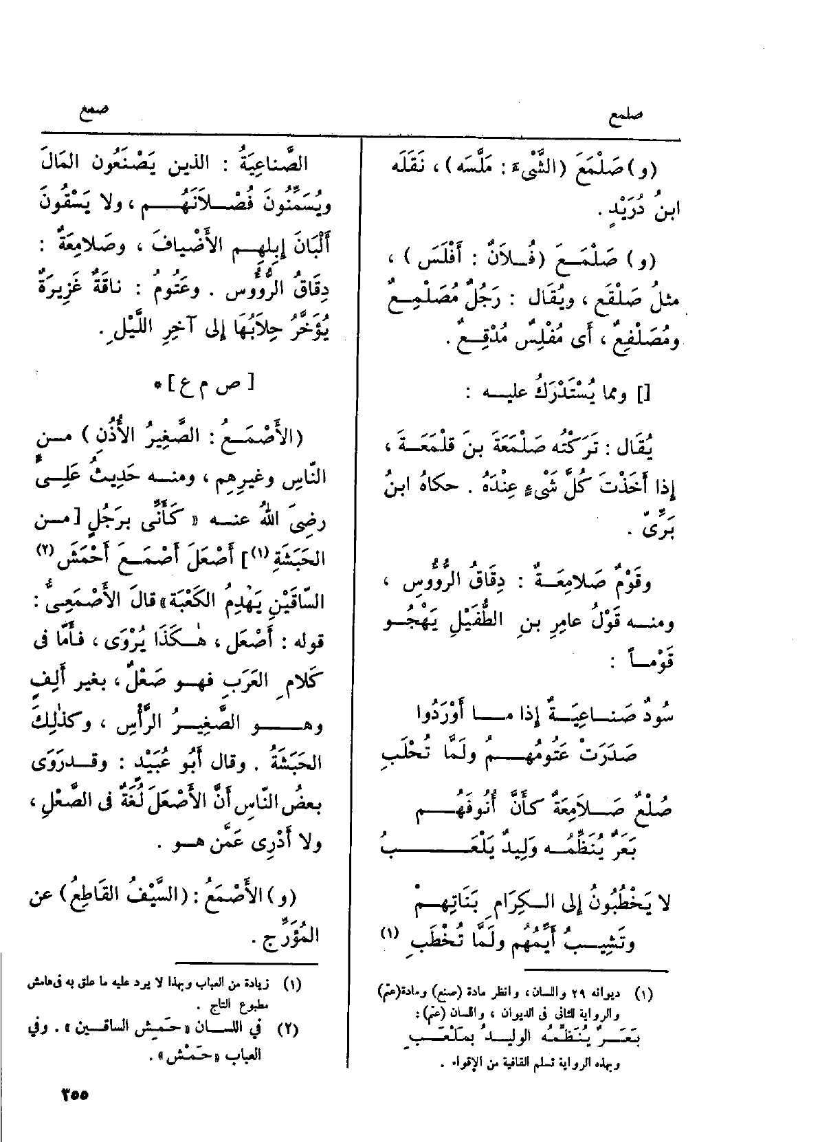 الصَّناعِيَة: الَّذين يصنعون المالَ ويُسَمِّنونَ فُصْلانَهم، وَلَا يَسْقُونَ ألبانَ إبلِهم الأضْياف، وصَلامِعَة: دِقاقُ الرؤوسِ. وعَتوم: ناقةٌ غَزيرةٌ يُؤَخَّرُ حِلابُها إِلَى آخرِ اللَّيْل.