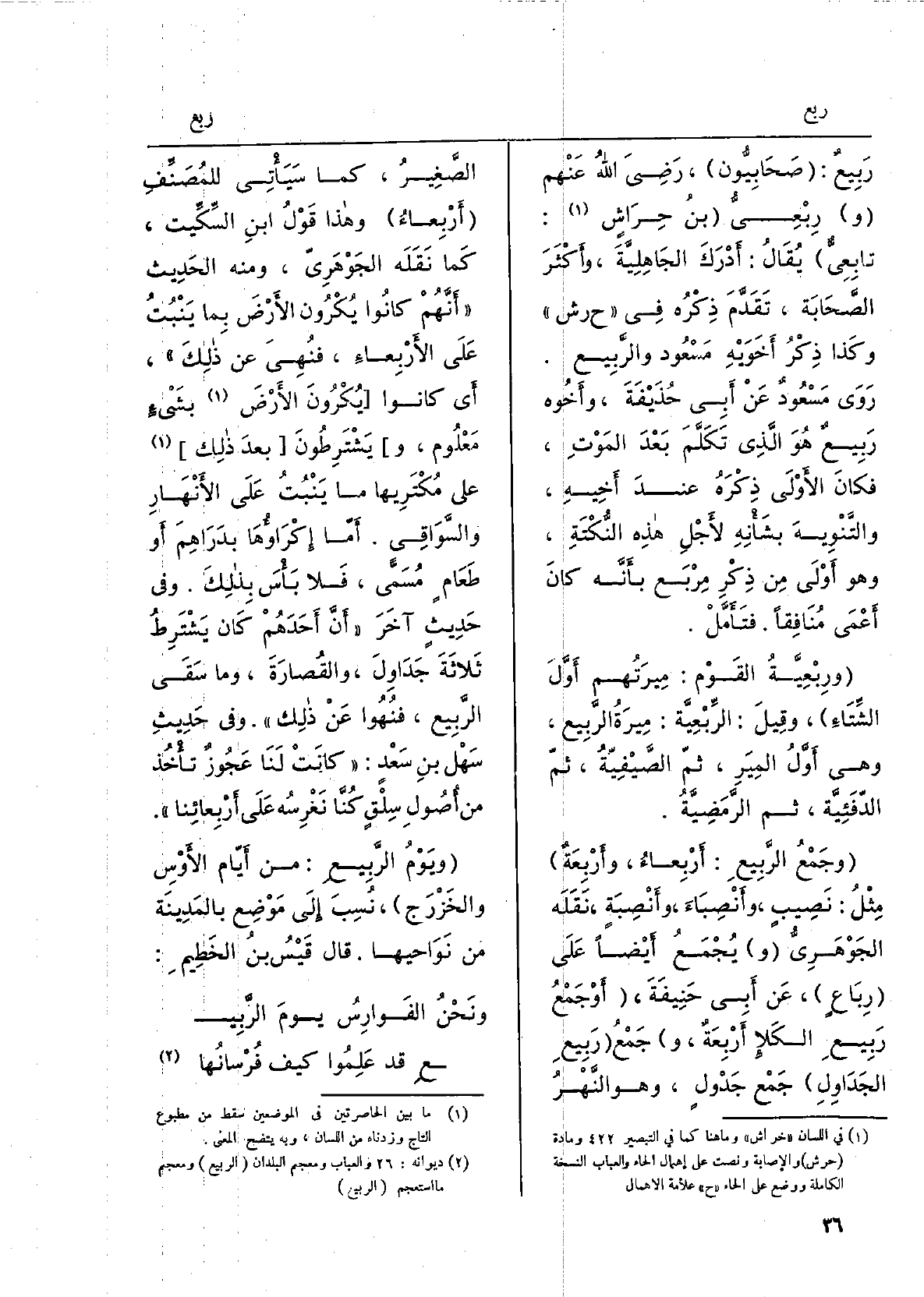 رَبيعٌ: صَحابِيُّون، رَضِي الله عَنْهُم. رِبْعِيُّ بنُ حِراشٍ: تابعِيٌّ يُقَال: أَدركَ الجاهليَّةَ، وأَكْثَرَ الصَّحابة، تقدَّم ذِكرُه فِي حر) ش. وَكَذَا ذِكْرُ أَخَوَيهِ مَسعود والرَّبيع. روَى مَسعودٌ عَن أَبي حُذَيْفَةَ، وأَخوه الَّذِي تكلَّمَ بعدَ المَوْتِ، فَكَانَ الأَولَى ذِكرَه عِنْد أَخيهِ، والتَّنويهَ بشأْنِهِ لأَجل هَذِه النُّكْتَةِ، وَهُوَ أَوْلَى من ذِكْرِ مِرْبَع بأَنَّه كانَ أَعمى مُنافِقاً. فتأَمَّلْ. ورِبْعِيَّةُ القَومِ: مِيرَتُهم أَوَّل الشتاءِ، وَقيل: الرِّبْعِيَّة: مِيرَةُ الرَّبيع، وَهِي أَوَّل المِيَرِ، ثمَّ الصَّيفِيَّةُ، ثمَّ الدّفَئِيَّة، ثمَّ الرَّمَضِيَّةُ. وجَمْعُ الرَّبيعِ: أَرْبِعاءُ، وأَرْبِعَةٌ، مثلُ نَصيبٍ، وأَنصِباءَ، وأَنصِبَةٍ، نَقله الجَوْهَرِيّ. يُجمَعُ أَيضاً على رِباعٍ، عَن أَبي حَنيفَةَ، أَو جَمْعُ رَبيعِ الكَلأِ أَرْبِعَةٌ، وجَمْعُ ربيعِ الجَداوِلِ، جَمْعَ جَدْوَلٍ، وَهُوَ النَّهر الصَّغير، كَمَا سيأْتي للمصنِّف أَربِعاءُ، وَهَذَا قولُ ابْن السِّكِّيت، كَمَا نقلَه الجَوْهَرِيّ، وَمِنْه الحَدِيث أَنَّهم كَانُوا يُكرُونَ الأَرْضَ بِمَا يَنْبُتُ على الأَرْبِعاءِ، فنُهِيَ عَن ذَلِك. أَي كَانُوا يُكرُونَ الأَرضَ بشيءٍ مَعلومٍ، ويَشترطون بعدَ ذلكَ على مُكتَريها مَا يَنْبُتُ على الأَنهار والسَّواقي. أَمّا إكْراؤُها بدراهِمَ أَو طَعامٍ مَسمَّىً، فَلَا بأْسَ بذلكَ. وَفِي حديثٍ آخر: أَنَّ أَحدَهم كَانَ يشترِطُ ثلاثةَ جَداوِلَ، والقُصارَةَ، وَمَا سَقى الرَّبيع، فنُهوا عَن ذَلِك. وَفِي حَدِيث سهل بنِ سَعدٍ: كَانَت لنا عَجوزٌ تأْخُذُ من أُصولِ سِلْقٍ كنَّا نَغرِسُه على أَرْبِعائِنا. ويَوْمُ الرَّبيعِ: من أَيّام الأَوسِ والخَزْرَج، نُسِبَ إِلَى مَوضِع بالمدينةِ من نَوَاحِيهَا. قَالَ قيس بن الخَطيمِ: