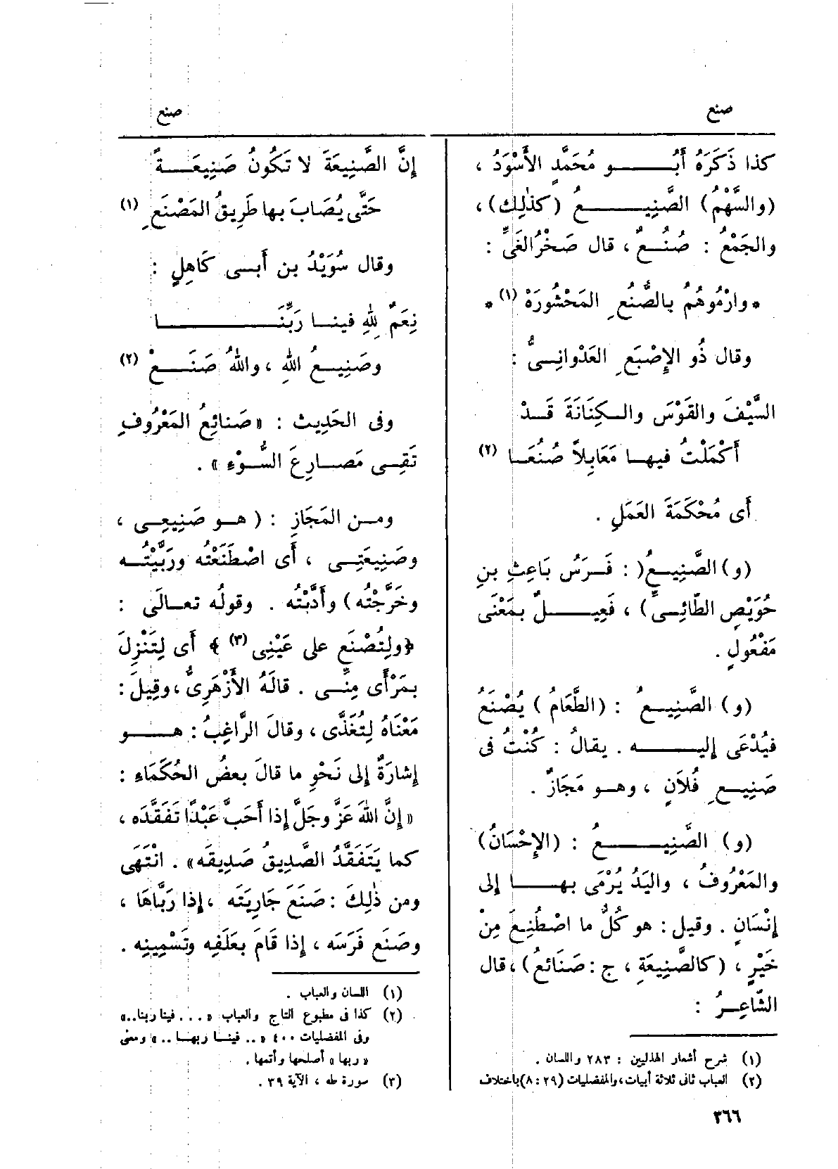 أَي مُحكَمةَ العمَل. الصَّنيعُ: فرَسُ باعِثِ بنِ حُوَيْصٍ الطائيِّ، فعيلٌ بِمَعْنى مَفْعُولٍ. الصَّنيع: الطعامُ يُصنَعُ فيُدعى إِلَيْهِ. يُقَال: كنتُ فِي صَنيعِ فلانٍ، وَهُوَ مَجاز. الصَّنيع: الإحسانُ والمَعروف، واليَدُ يُرمى بهَا إِلَى إنْسانٍ. وَقيل: هُوَ كلُّ مَا اصْطُنِعَ مِن خَيْرٍ، كالصَّنيعَةِ، ج: صَنائِع، قَالَ الشَّاعِر: إنَّ الصَّنيعَةَ لَا تَكونُ صَنيعَةًحتى يُصابَ بهَا طَريقُ المَصنَعِ وَقَالَ سُوَيْدُ بن أبي كاهِلٍ: