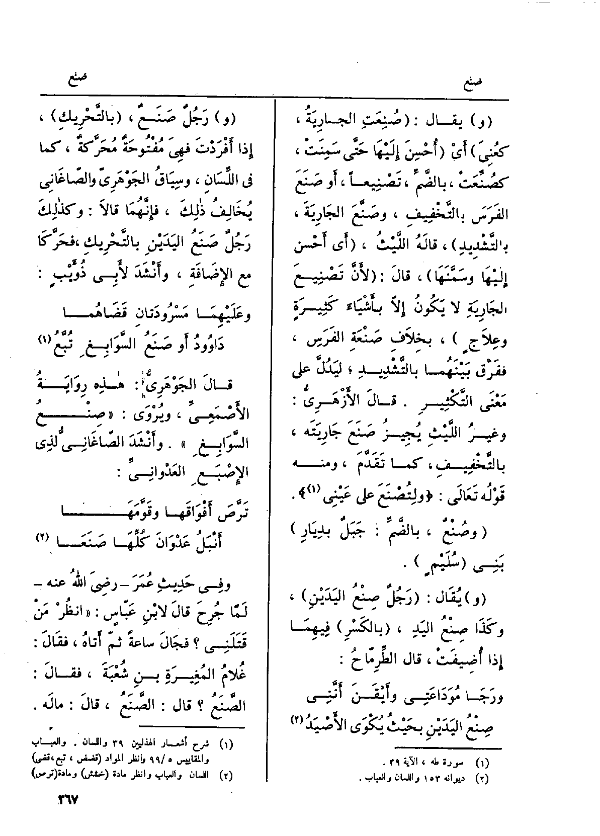 وَفِي حديثِ عمر رَضِي الله عَنهُ لمّا جُرِحَ قَالَ لابنِ عَبّاسٍ: انْظُرْ مَن قَتَلَني فجالَ سَاعَة ثمّ أَتَاهُ، فَقَالَ: غُلامُ المُغيرَةِ بنِ شُعبَةَ، فَقَالَ: الصَّنَع قَالَ: الصَّنَع، قَالَ: مالَه.