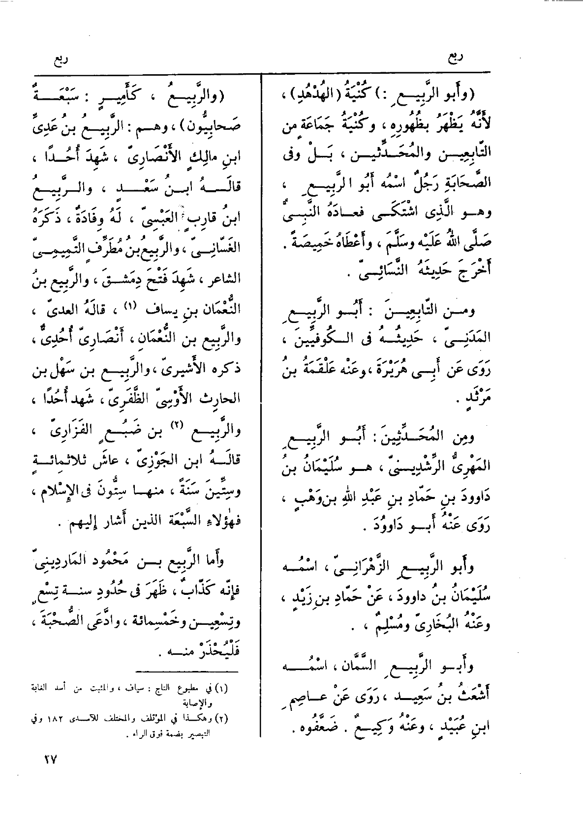 وأَبو الرَّبيعِ: كُنيَةُ الهُدْهُدِ، لأَنَّه يَظْهَرُ بظُهورِهِ، وكُنيَةُ جَماعَةٍ من التَّابِعين والمُحَدِّثين، بل وَفِي الصَّحابَةِ رَجُلٌ اسْمه أَبو الرَّبيعِ، وَهُوَ الَّذِي اشْتَكَى فعادَه النَّبيُّ صلّى الله عَلَيْهِ وسلَّم، وأَعطاه خَميصَةً. أَخرَج حديثَه النِّسائيّ. وَمن التَّابعين: أَبو الرَّبيع المَدَنيّ، حديثُه فِي الكُوفِيّينَ، روَى عَن أَبي هُريْرَةَ، وَعنهُ علقَمَةُ بنُ مَرْثَدٍ. وَمن المُحَدِّثينَ: أَبو الرَّبيعِ المَهْرِيُّ الرَّشْدينِيّ، هُوَ سليمانُ بنُ داوودَ بنِ حَمَّادِ بنِ عَبْد الله بنِ وَهْبٍ، روَى عَنهُ أَبو داوودَ. وأَبو الرَّبيع الزَّهرانِيّ، اسمُه سليمانُ بنُ داوودَ، عَن حَمَّادِ بنِ زَيْدٍ، وَعنهُ البُخارِيُّ ومسلِمٌ. وأَبو الرَّبيعِ السَّمّان، اسمُه أَشْعَثُ بنُ سعيد، روَى عَن عاصِمِ بنِ عُبَيدٍ، وَعنهُ وَكِيعٌ. ضَعَّفُوه. والرَّبيعُ، كأَميرٍ: سَبعةٌ صَحابِيُّون، وهم: الرَّبيعُ بنُ عَدِيِّ بنِ مالِكٍ الأَنصارِيّ، شَهِدَ أُحُداً، قَالَه ابنُ سَعْدٍ، والرَّبيع بنُ قارِبٍ العَبْسِيّ، لَهُ وِفادَةٌ، ذكرَه الغسَّانِيّ، والرَّبيع بنُ مُطَرِّفٍ التَّميميّ الشَّاعِر، شَهِدَ فتحَ دِمشقَ، والرَّبيع بنُ النُّعمان بنِ يَساف، قَالَه العديّ، والرَّبيع بن النُّعمان أَنصارِيٌّ أُحُدِيٌّ، ذكرَه الأَشيريّ. والرَّبيع بن سهل بن الْحَارِث الأَوْسِيّ الظَّفَرِيّ، شهدَ أُحُداً. والرَّبيع بن ضَبُعٍ)