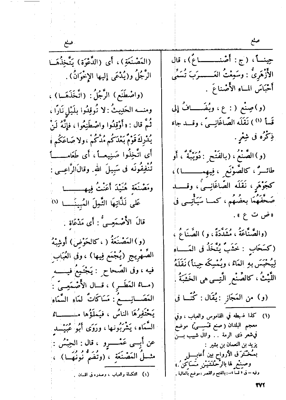 حِيناً، ج: أَصْنَاعٌ، قَالَ الأَزْهَرِيّ: وسَمعتُ العربَ تُسمِّي أَحْبَاسَ الماءِ الأَصْناعَ. صِنْع: ع، ويُضافُ إِلَى قَساً نَقَلَه الصَّاغانِيّ، وَقد جاءَ ذِكرُه فِي شِعرٍ. الصَّنْع بالفَتْح: دُوَيْبَّةٌ، أَو طائرٌ، كالصَّوْنَع، فيهمَا، كَجَوْهَرٍ، نَقله الصَّاغانِيّ، وَقد صَحَّفَهما بعضُهم، كَمَا سَيَأْتِي فِي ضتع. والصَّنَّاعَة، مُشدَّدةً، والصَّنَاع كَسَحَابٍ: خَشَبٌ يُتَّخَذُ فِي الماءِ ليُحبَسَ بِهِ الماءُ، ويُمسِكُه حِيناً، نَقله الليثُ، كالصِّنْعِ الَّتِي هِيَ الخشَبةُ. منَ المَجاز: يُقَال: كُنّا فِي المَصْنَعةِ، أَي الدَّعْوَة يَتَّخِذُها الرجلُ ويُدعى إِلَيْهَا الإخْوانُ. واصْطَنعَ الرجلُ: اتَّخَذَها، وَمِنْه الحديثُ: لَا تُوقِدوا بلَيلٍ نَارا، ثمّ قَالَ: أَوْقِدوا واصْطَنِعوا، فإنّه لن يُدرِكَ قومٌ بعدَكم مُدَّكُم، وَلَا صاعَكم أَي اتَّخِذوا صَنيعاً، أَي طَعاماً تُنفِقونَه فِي سبيلِ الله، وَقَالَ الرَّاعِي:)