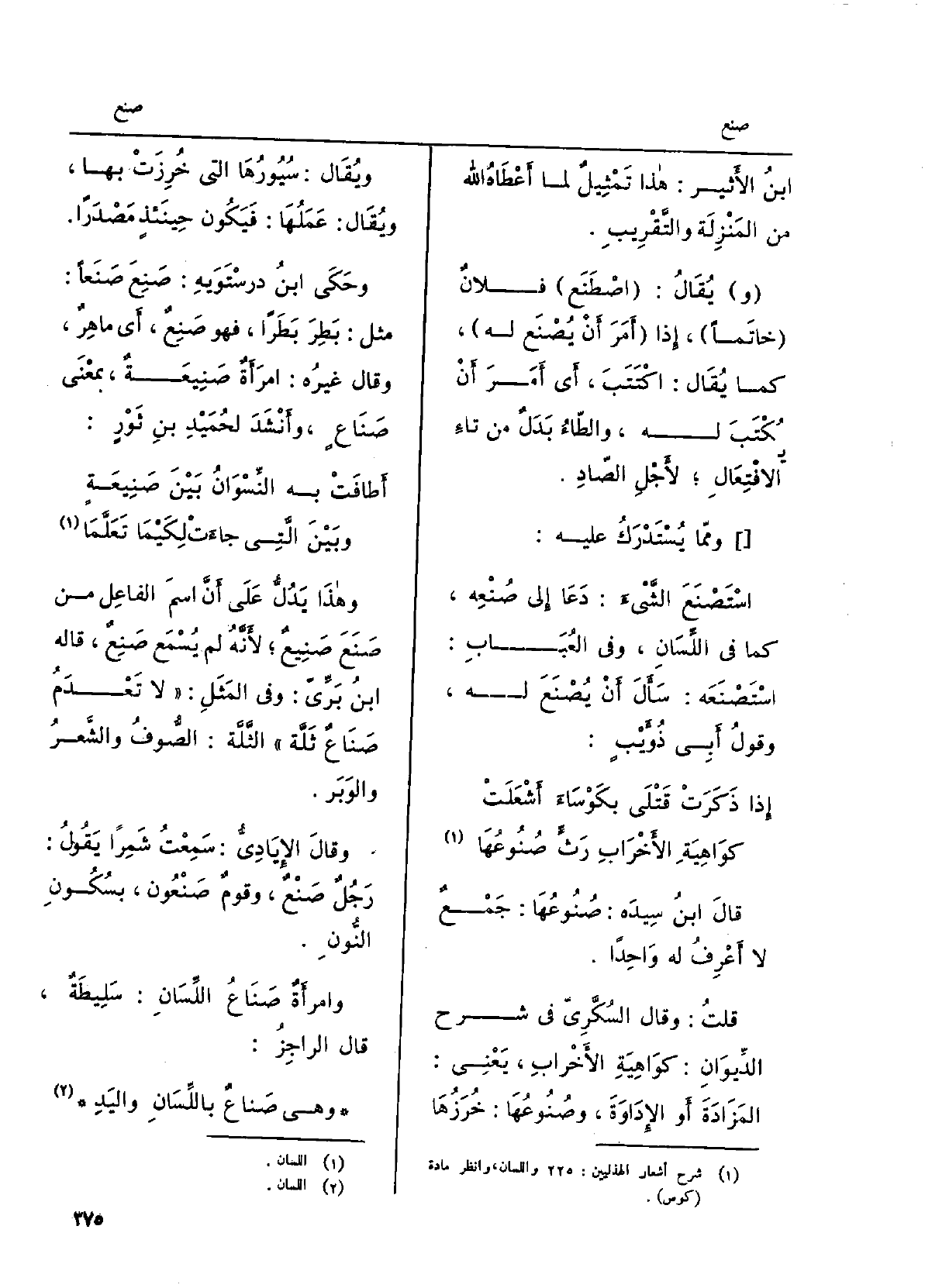 قَالَ ابنُ سِيدَه: صُنوعُها: جَمْعٌ لَا أعرفُ لَهُ وَاحِدًا. قلتُ: وَقَالَ السُّكَّريُّ فِي شرحِ الدِّيوان: كواهِيَةِ الأخرابِ، يَعْنِي: المَزادَةَ أَو الإداوَة، وصُنوعُها: خُرَزُها وَيُقَال: سُيورُها الَّتِي خُرِزَتْ بهَا، وَيُقَال: عمَلُها: فَيكون حينَئِذٍ مصدرا. وَحكى ابنُ درسْتَوَيْه: صَنِعَ صَنَعَاً: مثل: بَطِرَ بَطَرَاً، فَهُوَ صَنِعٌ، أَي ماهِرٌ، وَقَالَ غيرُه: امرأةٌ صَنيعَةٌ، بِمَعْنى صَنَاعٍ، وأنشدَ لحُمَيْدٍ بنِ ثَورٍ: