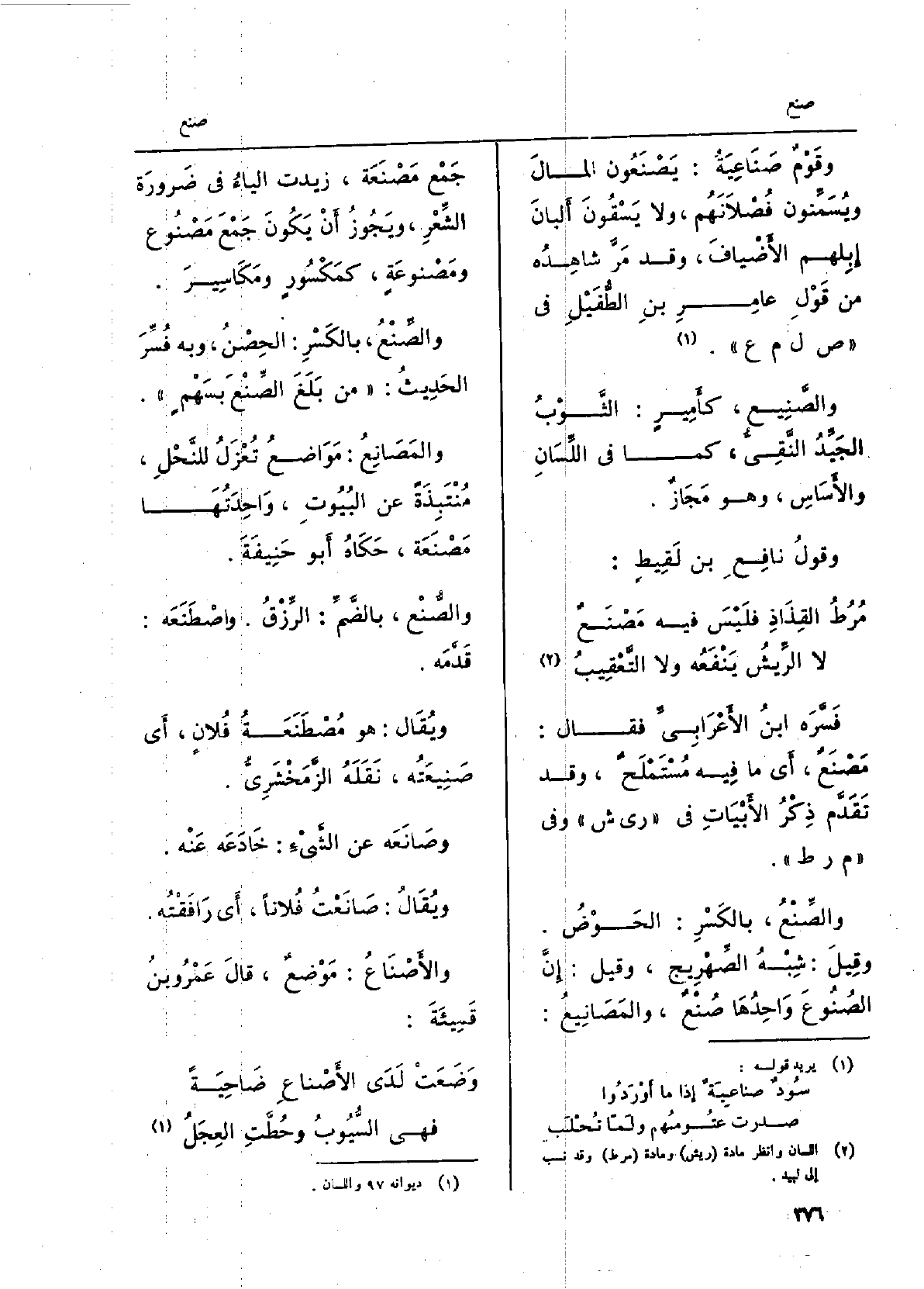فسَّرَه ابْن الأَعْرابِيّ فَقَالَ: مَصْنَعٌ، أَي مَا فِيهِ مُستَملَحٌ، وَقد تقدّم ذِكرُ الأبياتِ فِي ريش وَفِي مرط. والصِّنْع، بالكَسْر: الحَوضُ. وَقيل: شِبهُ الصِّهريجِ، وَقيل: إنَّ الصُّنوعَ واحدُها صُنْعٌ، والمَصانيع: جَمْعُ مَصْنَعة، زيدت الياءُ فِي ضَرورةِ الشِّعرِ، ويجوزُ أَن يكونَ جَمْعَ مَصْنُوعِ ومَصْنُوعةٍ، كَمَكْسورٍ ومَكاسيرَ. والصِّنْع، بالكَسْر: الحِصنُ، وَبِه فُسِّرَ الحديثُ: من بَلَغَ الصِّنْعَ بسَهْمٍ. والمَصانِع: مَواضِعُ تُعزَلُ للنَّحلِ، مُنتَبِذَةً عَن الْبيُوت، واحدتُها مَصْنَعة، حَكَاهُ أَبُو حَنيفة.